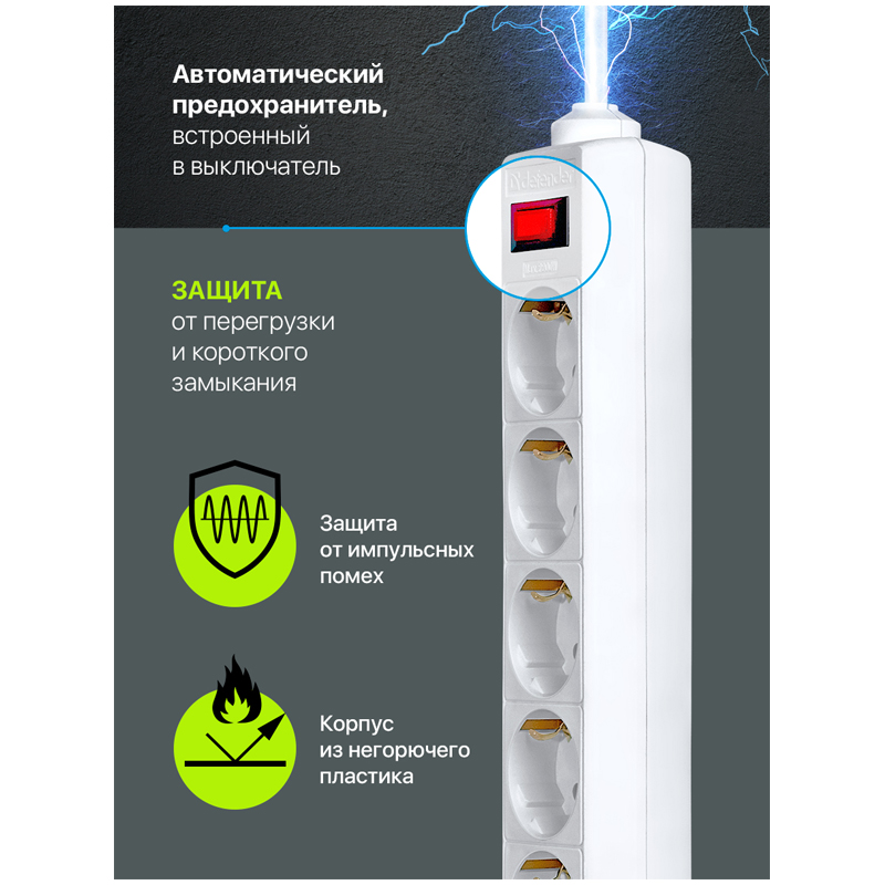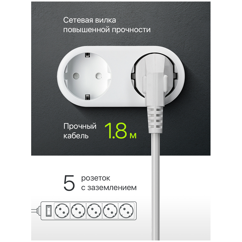 5 розеток, расположенных под углом, упростят подключение необходимого количества электротехники одновременно. Длина шнура составляет 1,8 м, максимальный ток нагрузки – 10 А, напряжение – 220 В, частота напряжения – 50 Гц. Корпус выполнен из высококачественного, ударопрочного, негорючего пластика. Каждая розетка оборудована заземляющими контактами. Подобная защита исключает случайное поражение электрическим током, что особенно актуально, если в помещении, где используются электроприборы, есть дети. Стандартные размеры (310х89х49 мм) и вес (330 г) помогут с легкостью разместить сетевой фильтр.
