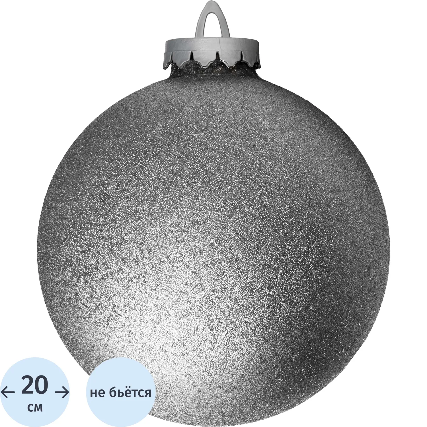 Ёлочный шар выполнен из пластика и имеет диаметр 20 см. Яркий серебристый шар с глиттером идеально подойдёт для оформления как уличных, так и интерьерных ёлок, а также для украшения витрин магазинов и общественных зон. Несмотря на большие размеры, этот шар обладает малым весом, что позволяет легко крепить его с помощью лент, лески или декоративных шнурков.