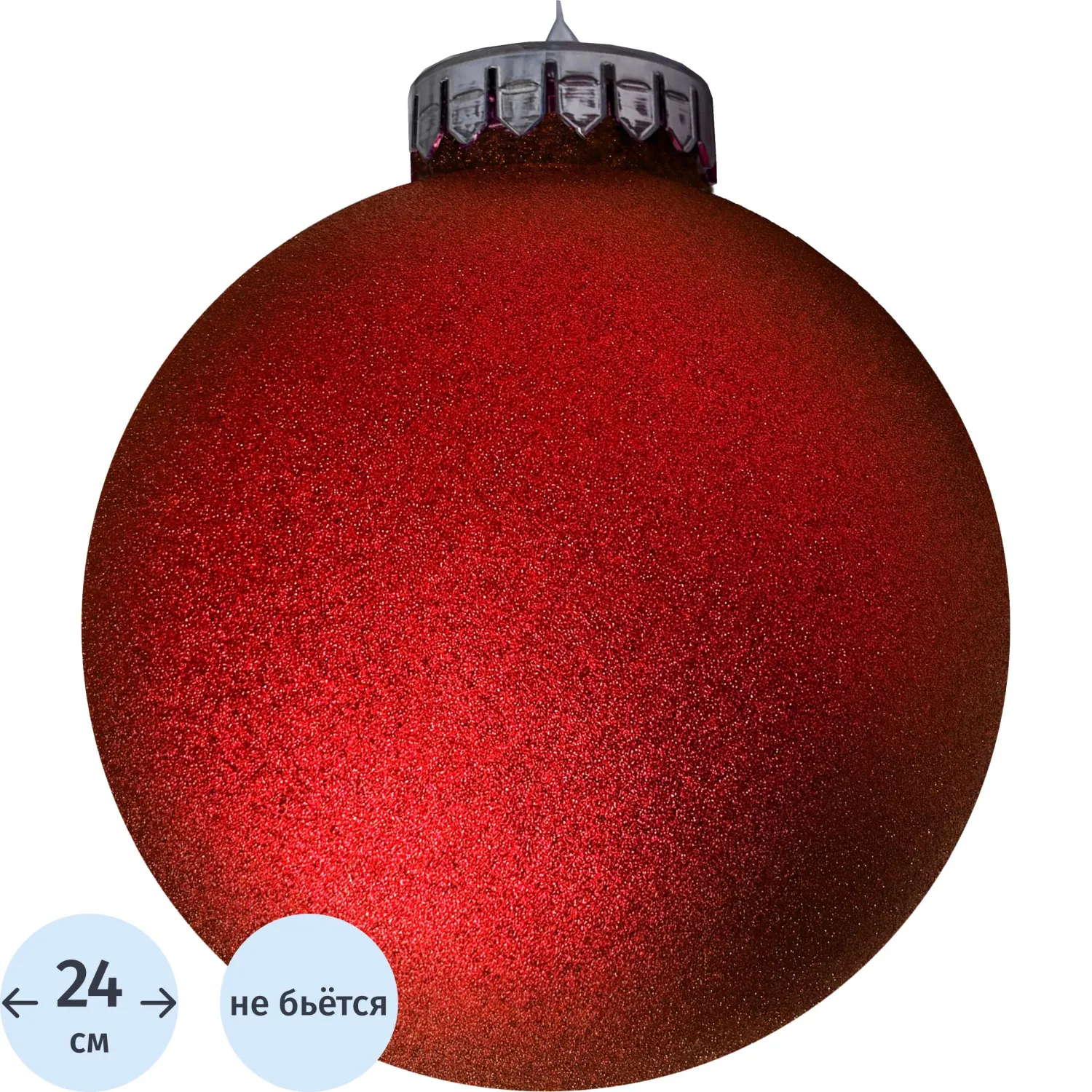 Ёлочный шар выполнен из пластика и имеет диаметр 24 см. Яркий красный шар с глиттером идеально подойдёт для оформления как уличных, так и интерьерных ёлок, а также для украшения витрин магазинов и общественных зон. Несмотря на большие размеры, этот шар обладает малым весом, что позволяет легко крепить его с помощью лент, лески или декоративных шнурков.