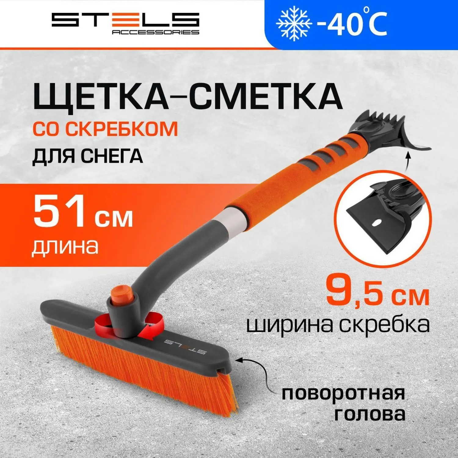 Щётка-смётка для снега со скребком Stels 55305 длиной 510 мм, с поворотной головой, служит для чистки автомобиля после снегопада. Поскольку её щетина распушена на кончиках, она не царапает поверхность кузова. Щётка-скребок пригодится автолюбителям.