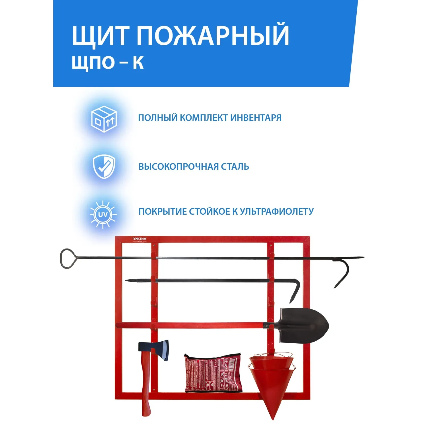 Пожарный ящик и пожарный инвентарь всегда под рукой, когда они вам нужны, благодаря удобному и безопасному хранению. Пожарный щит ЩПО-К ПРЕСТИЖ поможет вам быть готовыми к любым чрезвычайным ситуациям.