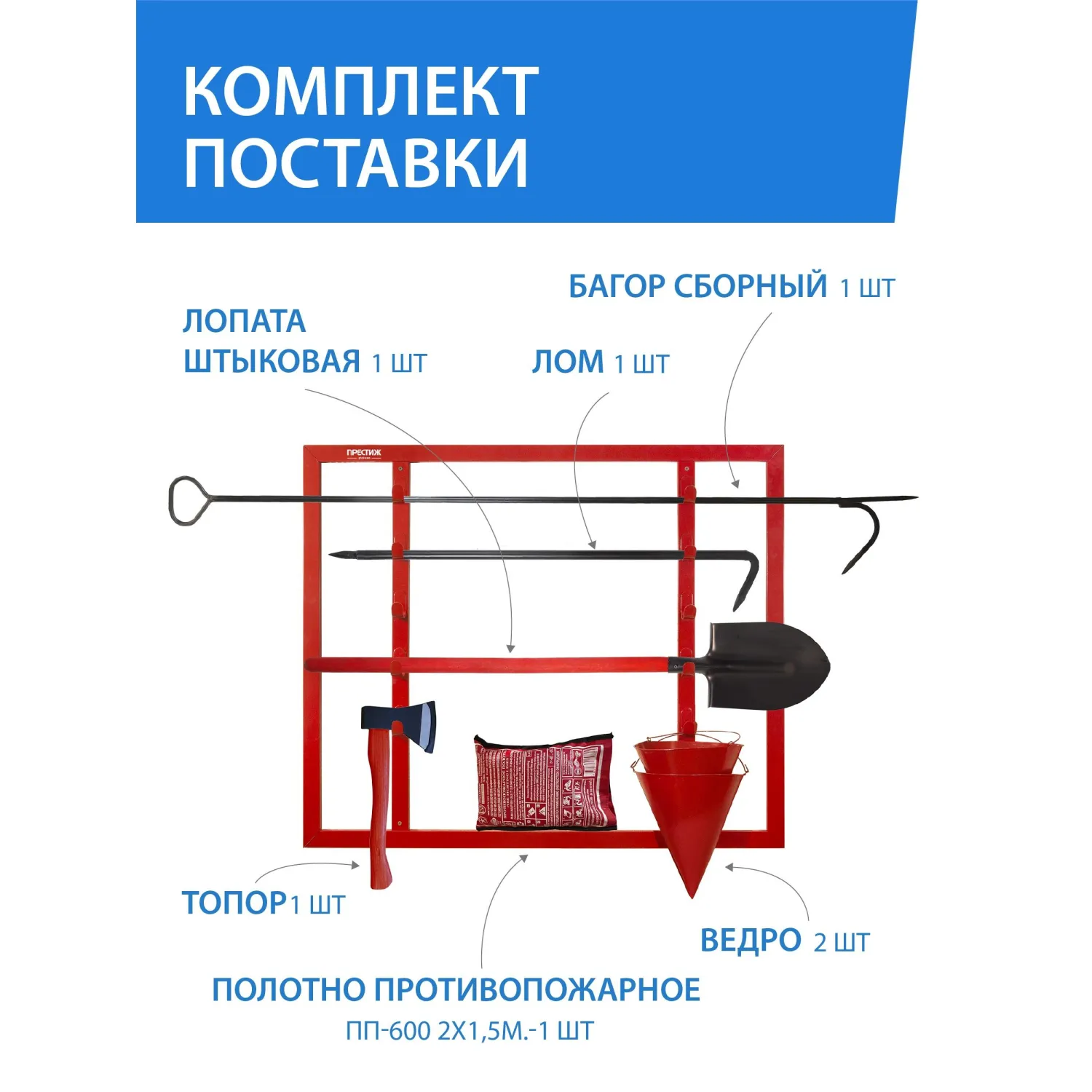 Пожарный щит в сборе — конструкция включает все необходимые элементы для быстрого доступа к пожарному инвентарю в случае чрезвычайной ситуации.