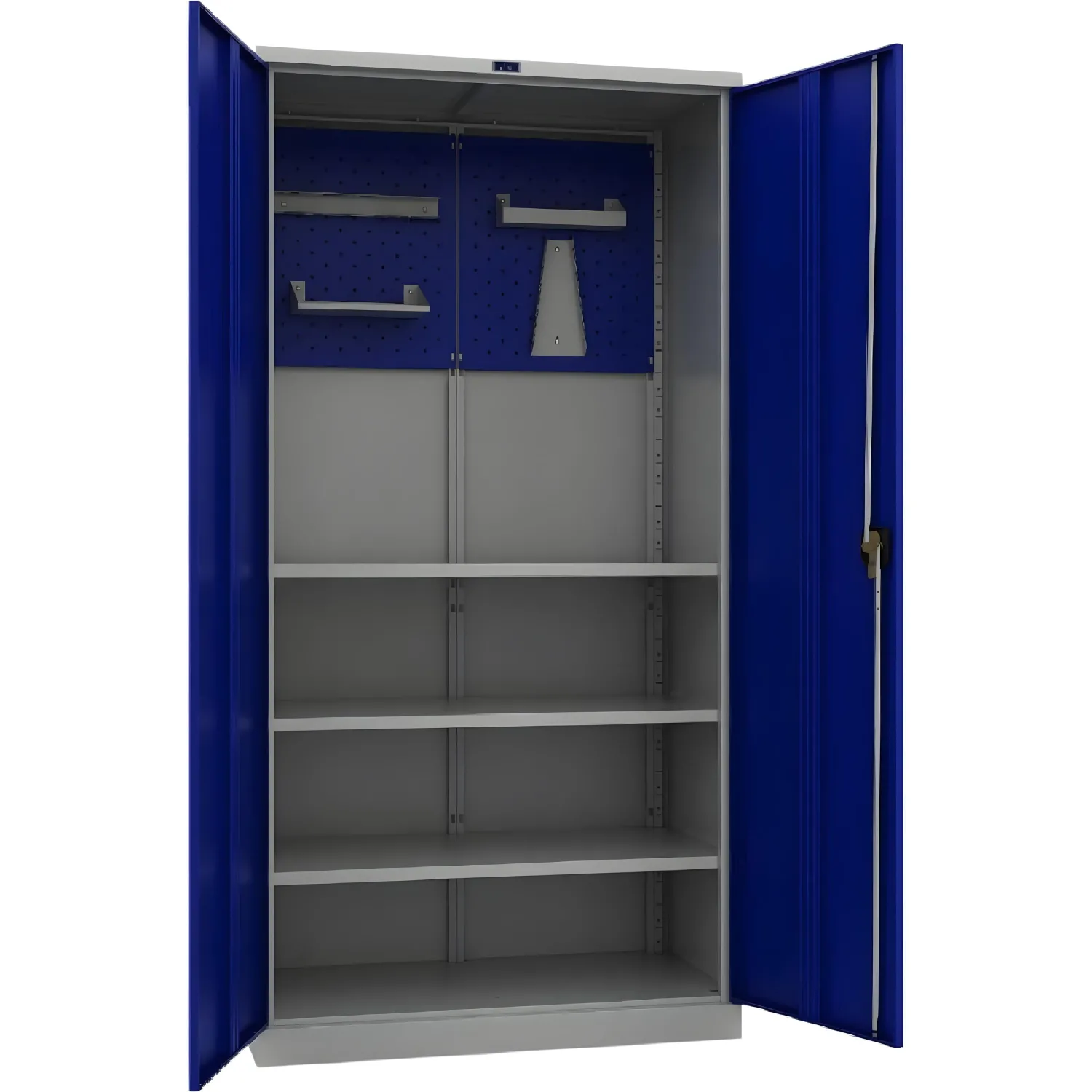 Ригели изготовлены из оцинкованной стали, пластиковые втулки обеспечивают бесшумный ход дверей и надежное запирание. Комплектуется ключевыми замками с ручками (Burg GSC813, 2 ключа в комплекте). Максимальная нагрузка на шкаф — 500 кг, на полку — 80 кг. Стандартный цвет: серый полуматовый (RAL 7038), двери — синие (RAL 5002). Тип покрытия — порошковое. Поставляется в разобранном виде.