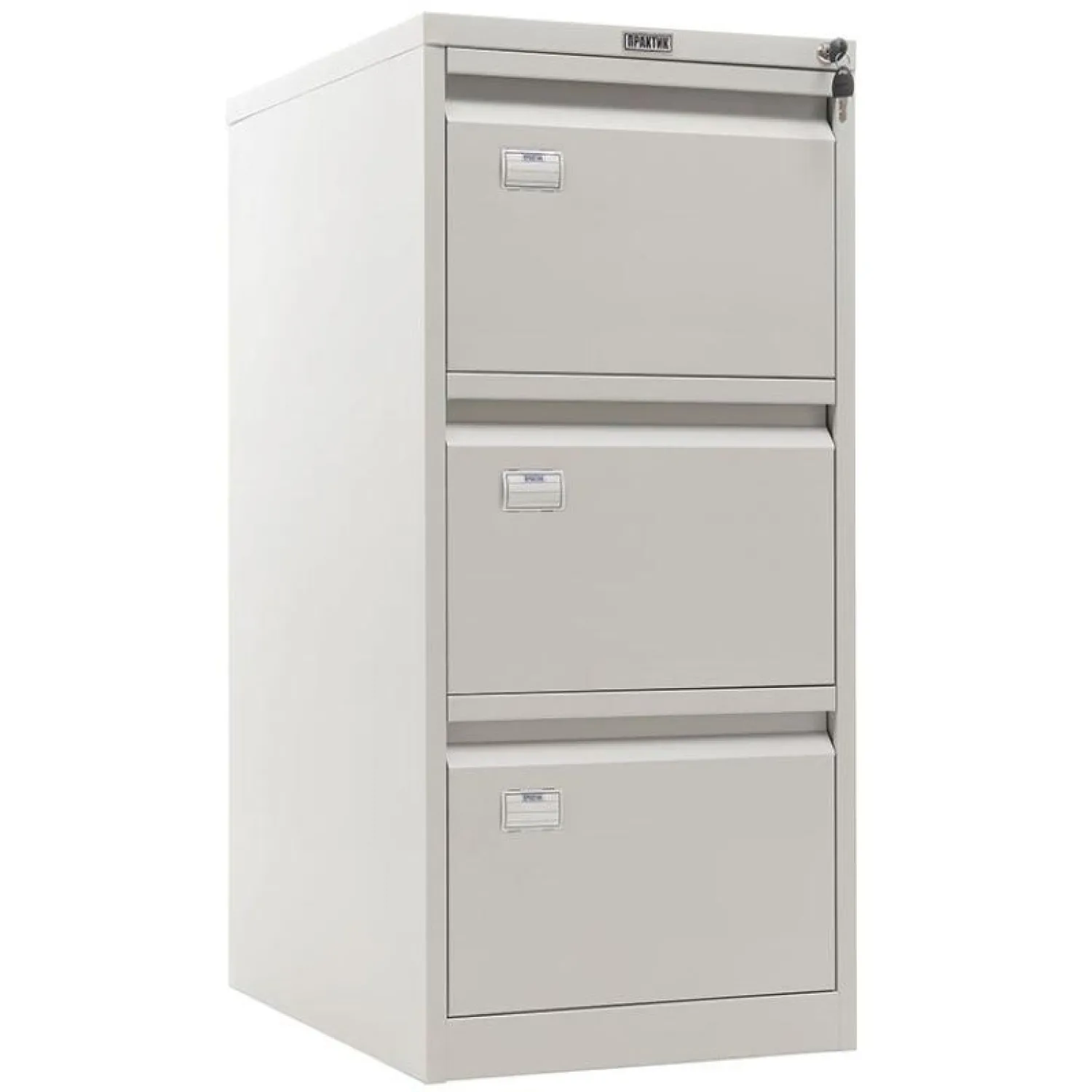 Шкаф картотечный предназначен для рационального и удобного хранения документов. Телескопические направляющие обеспечивают плавный ход ящиков при максимальной загрузке. Ящики выдвигаются на всю глубину и имеют дно. Комплектуется ключевым замком (1000 комбинаций) с возможностью смены цилиндра. Тип материала — металл толщиной 0,6 мм. Количество ящиков — 3 штуки. Внутренние размеры ящика (ВхШхГ): 267×391×560 мм. Максимальная нагрузка на ящик 30 кг. Формат папки Foolscap, А4. Антиопрокидывающее устройство. Замок центральный. Тип покрытия порошковое, стойкое к появлению царапин.