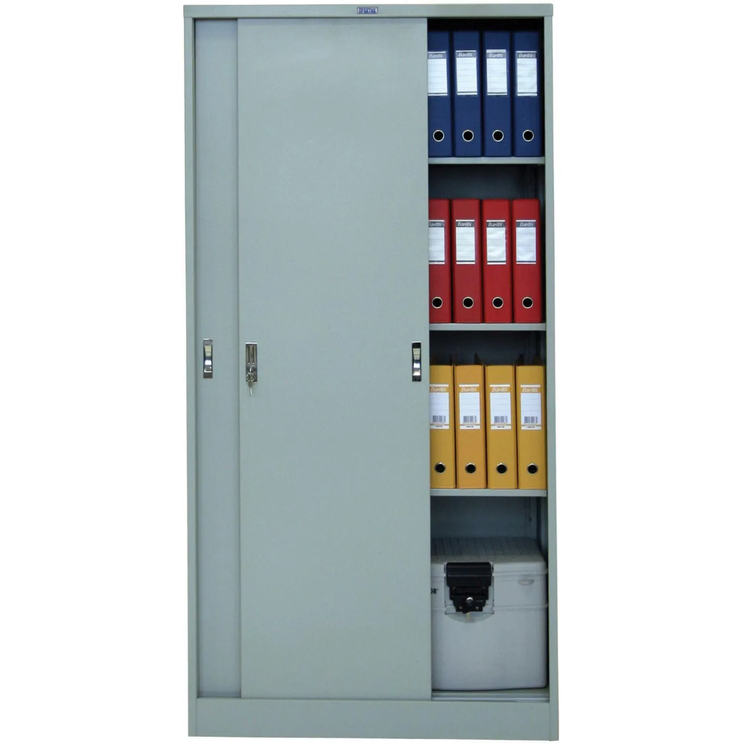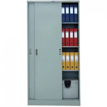 Шкаф-купе металлический архивный, изготовлен из металла с порошковым покрытием серого цвета. Раздвижные двери с роликовым механизмом позволяют использовать шкаф в условиях ограниченного пространства. Внутри три полки, высоту которых можно регулировать. Вмещает большой объем документов, удобен для хранения архивных папок. Шкаф-купе оборудован ключевым замком. Допустимая распределенная нагрузка на полку — до 60 кг.