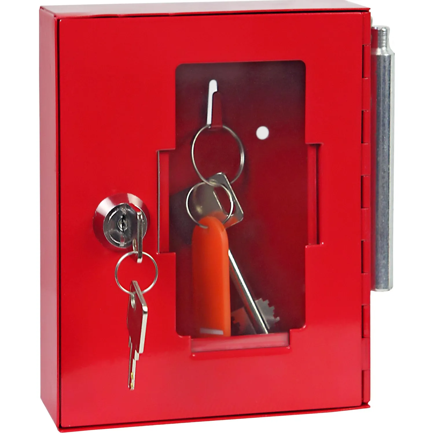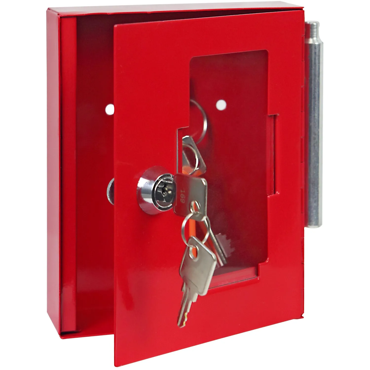 Металлическая настенная ключница для пожарного ключа Onix K1 изготовлена из стали с порошковым покрытием. Шкаф для аварийного ключа окрашен в красный цвет и предназначен для хранения 1 (одного) ключа от пожарного выхода. На лицевой стороне имеется стеклянная панель, которая в экстренных случаях или аварийной ситуации разбивается с помощью металлического молоточка. Размещение молоточка происходит с помощью магнита, разместить который можно на боковой или верхней стенки. На задней стенки имеются отверстия для крепления к стене. Шкаф поставляется в комплекте с двумя ключами, металлическим молоточком и магнитом для его крепления. Фурнитура для крепления к стене в комплект не входит.
