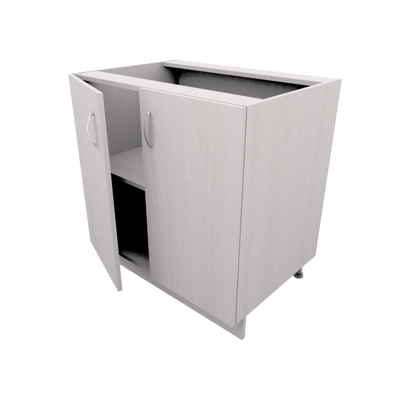 Отдельно стоящий модуль, выполненный из ЛДСП, с накладными фасадами, может скрепляться с другими модулями. Если модуль стоит крайним и видно его боковину, то необходимо заказывать дополнительно боковой цоколь, артикул 1006311.