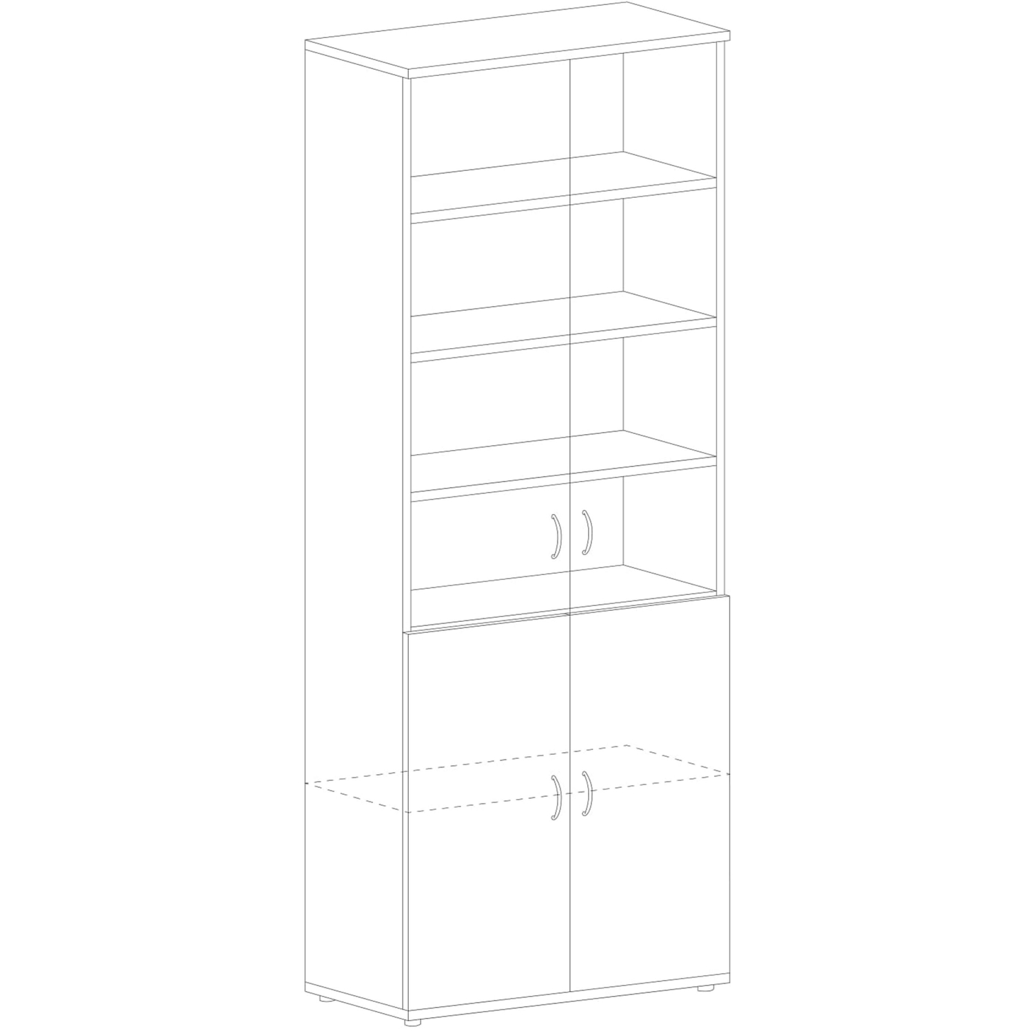 Шкаф для документов из коллекции офисной мебели Стратегия разделен на шесть ниш, из которых четыре верхние закрыты стеклянными дверцами, а две нижние ламинированными серого цвета.