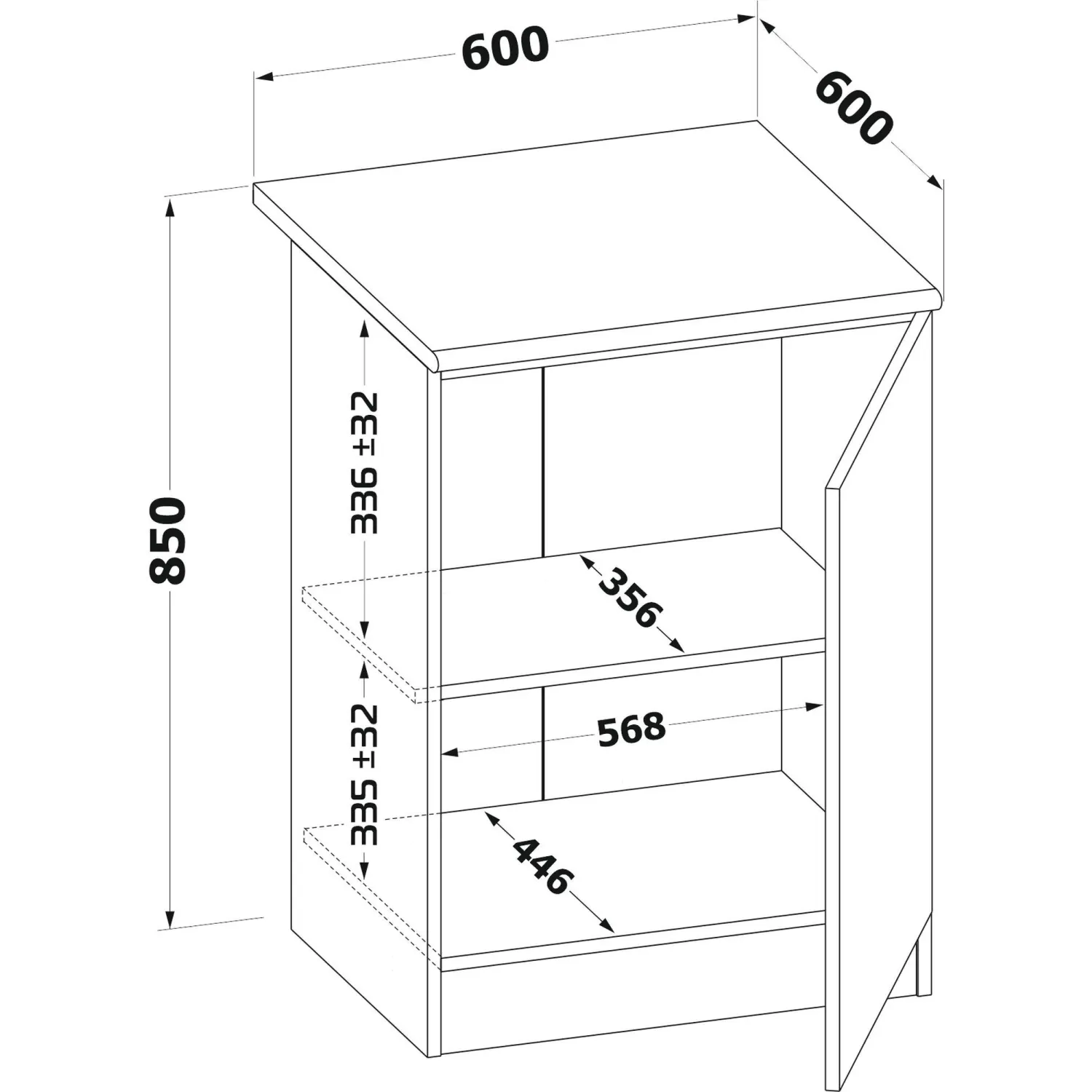 Кухонный стол с полкой внутри. Дверь можно навесить как справа, так и слева. Высота столешницы — 26 мм. Изготавливается из ЛДСП 16 мм, края обработаны кромкой ПВХ 0,4 мм. Ручки — металлические. Столешница сделана из ЛДСП с влагостойким прочным покрытием постформинг.