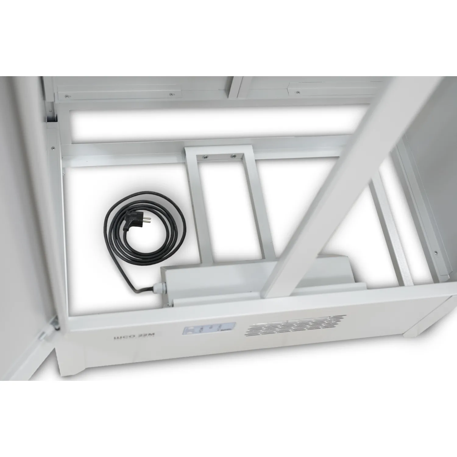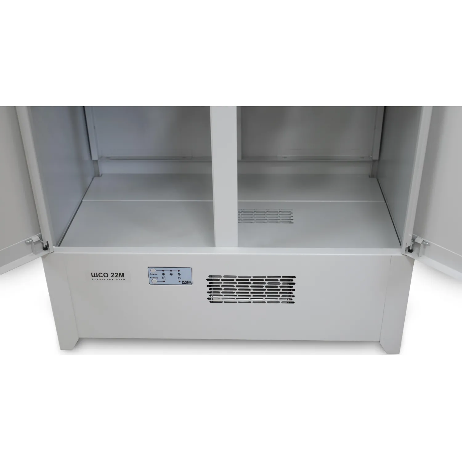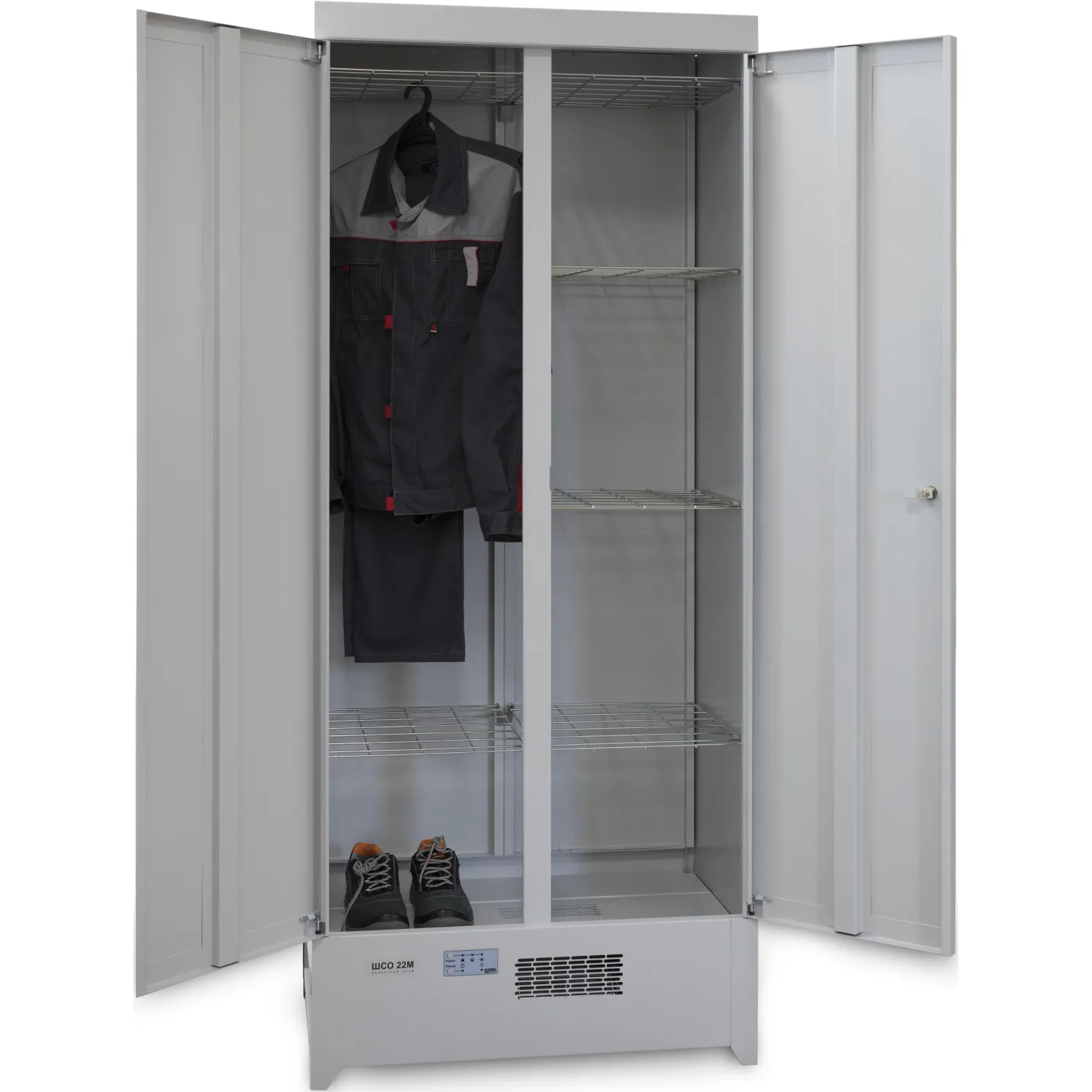 Верхняя часть корпуса закрывается двумя дверьми, в одной из которых установлен почтовый замок, запирающий одновременно обе двери. Внутри верхняя часть корпуса снабжена шестью съёмными сетчатыми полками. На полки можно укладывать для сушки рукавицы, головные уборы или обувь. К сетчатым полкам можно также подвешивать плечики с одеждой. В крышке шкафа расположено отверстие для выхода воздуха. В комплекте фланец для подключёния к внешней системе вентиляции. Нижняя подставка шкафа представляет собой рамную конструкцию, состоящую из передней и задней панелей, изготовленных из листовой стали, двух боковых и одной нижней рам, изготовленных из профильной трубы. В передней панели встроен блок нагрева. Блок нагрева состоит из: тангенциального вентилятора, игольчатого слюдяного нагревателя и электронного блока управления. Кнопки управления и световая индикация режимов работы расположены на лицевой стороне блока нагрева. В качестве защиты от перегрева используется термоплавкий предохранитель (без возврата в исходное положение). Рамная конструкция нижней подставки усиливает прочность и жёсткость шкафа, что даёт возможность переносить или передвигать его, кроме того, открытое с боковых сторон пространство, делает возможным влажную уборку пола под шкафом.
