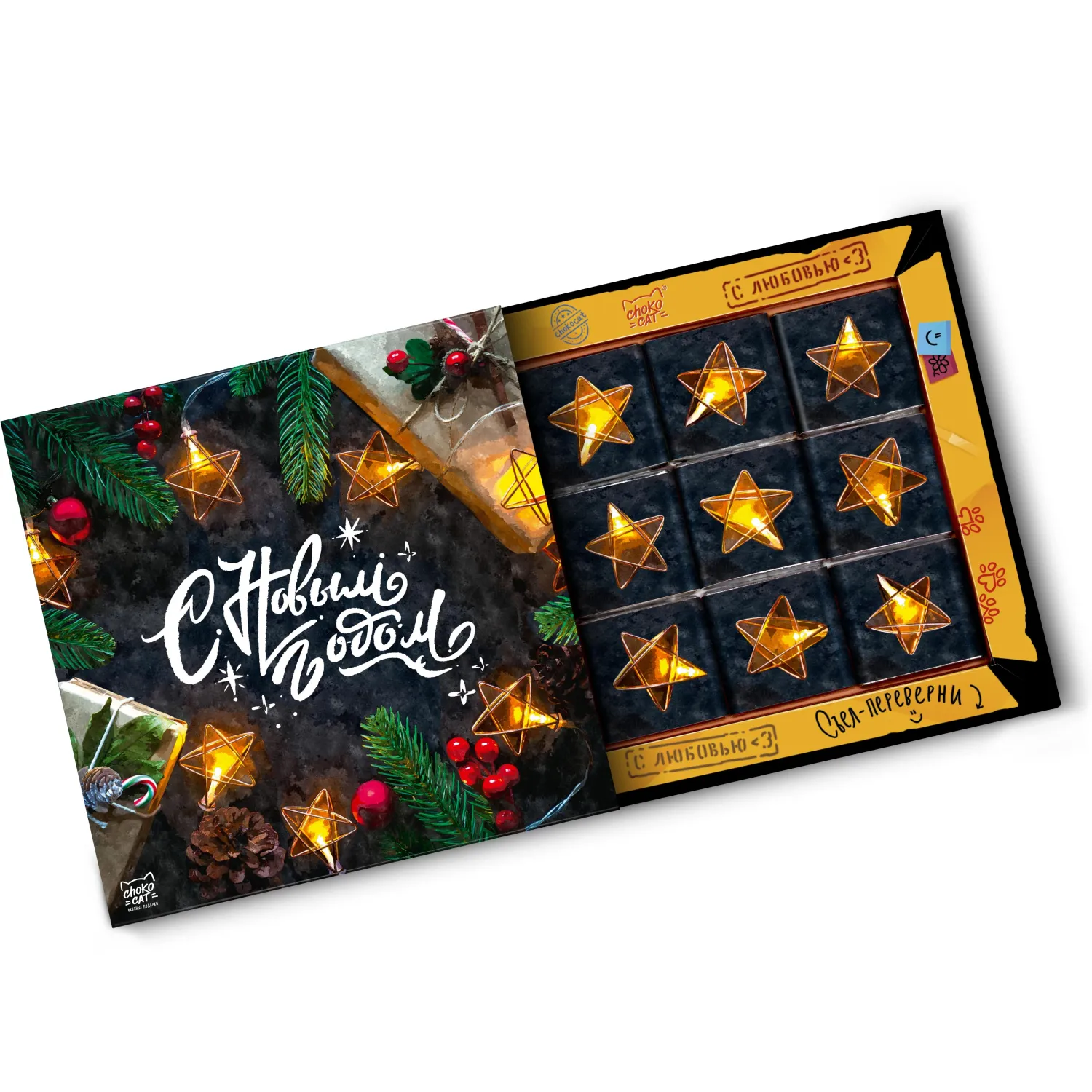 Подарочный набор с девятью плитками молочного шоколада — праздничное лакомство и приятный сувенир. Каждая плитка завёрнута в красочную индивидуальную этикетку с тёплым посланием, что делает подарок ещё более атмосферным.