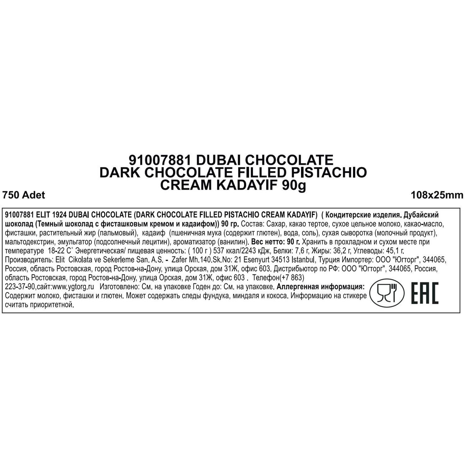 О товаре «Шоколад Elit 1924 Дубайский тёмный с фисташковой начинкой и кадаифом 90 г»