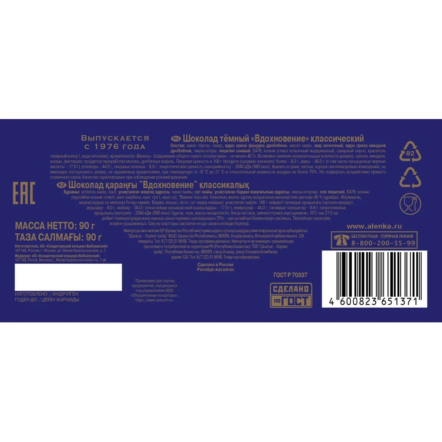 Классический шоколад «Вдохновение», созданный по оригинальной рецептуре 1976 года, с дроблёными ядрами жареного фундука. Насыщенный вкус какао, благородная горчинка с тонкими нотками жареных орехов. Тающая текстура и россыпь хрустящих ореховых осколков. Изысканное послевкусие и традиционная форма тонких палочек в серебристой фольге.