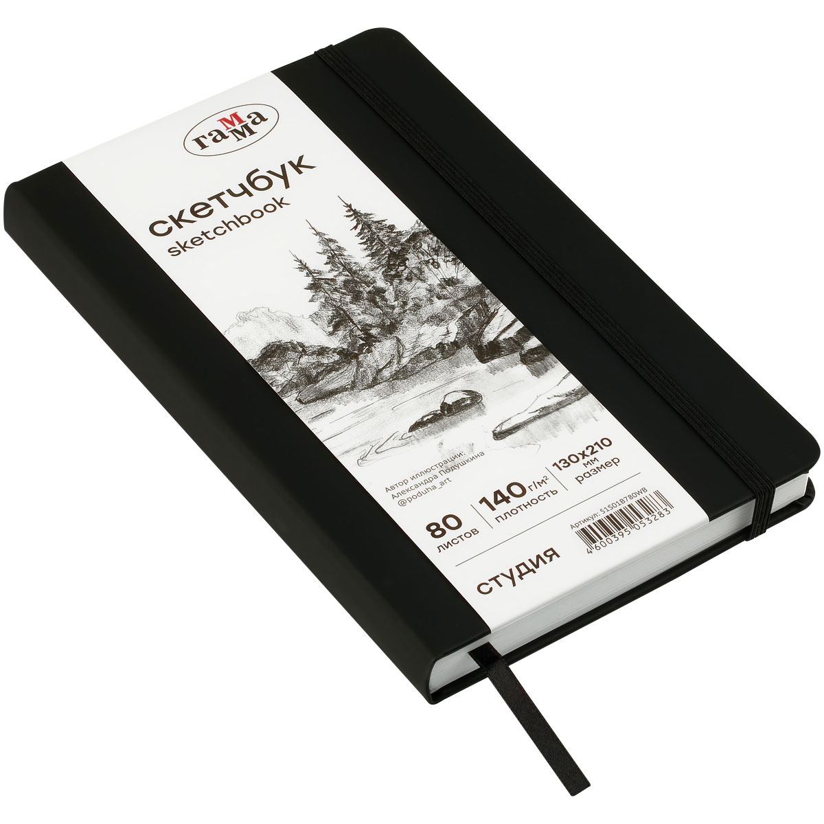 О товаре «Скетчбук 80л., 130*210 Гамма "Студия", черный, твердая обложка, на резинке, белая, 140г/м2»