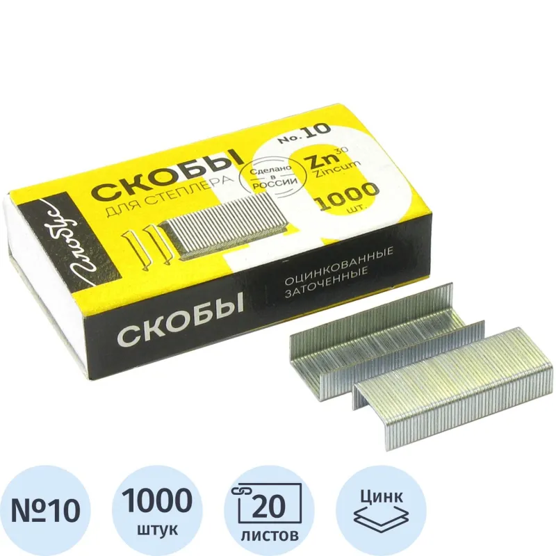 Скобы для степлера № 10 выполнены из качественного металла с цинковым покрытием. Предназначены для степлеров со сшивающей способностью до 20 листов (для бумаги толщиной 0.07 и 0.08 мм). В картонной упаковке 1000 скоб.