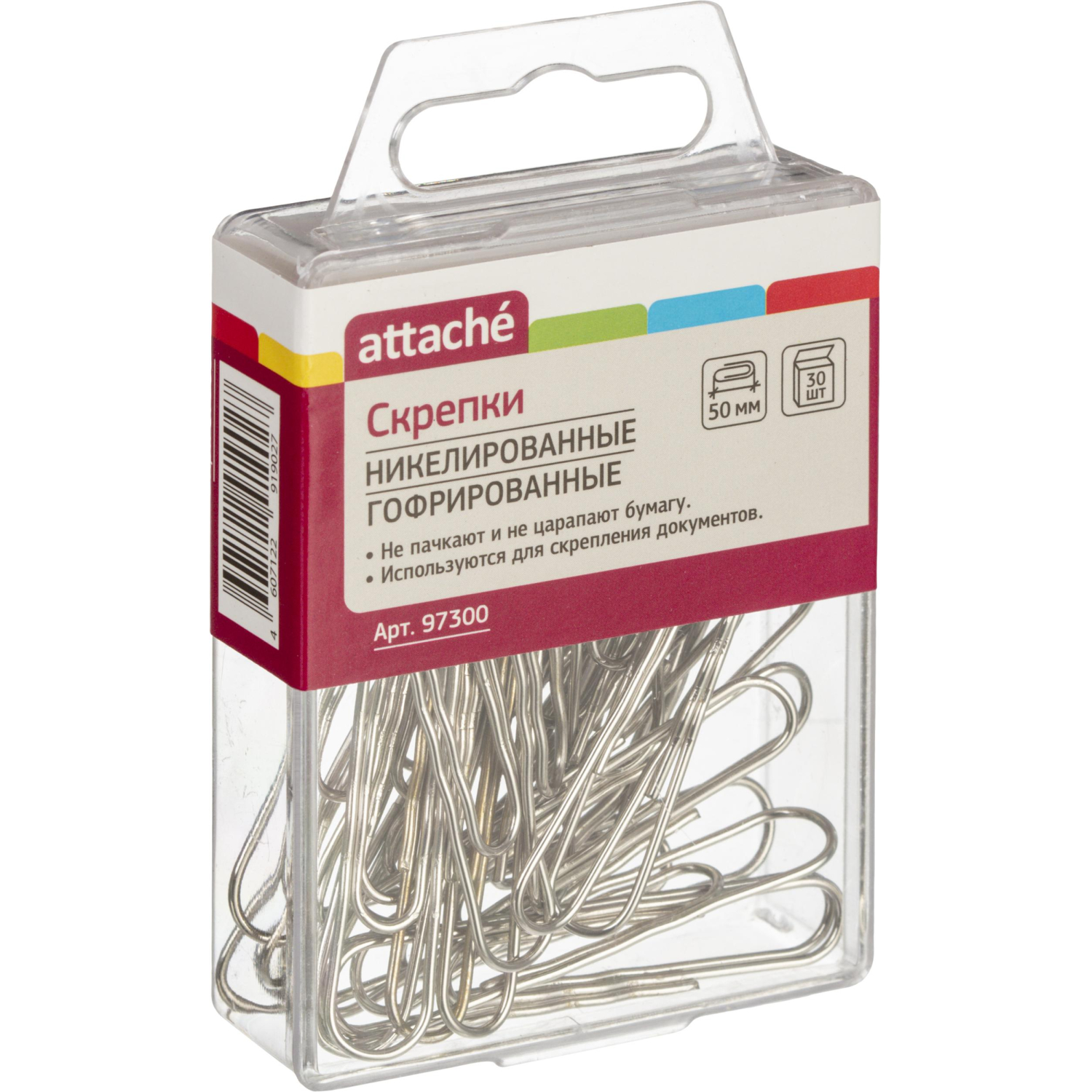 Скрепки Attache незаменимы при работе в офисе или дома, когда нужно соединить несколько бумаг, например, все листы договора или другие важные документы. Изготовлены из металла, никелированные. Имеют гофрированную поверхность и удобную закругленную форму. Не окисляются и не портят бумагу. В пластиковой коробочке с подвесом. Размер — 50 мм. Для большого объема документов. В упаковке 30 штук. В промежуточной упаковке 80 пачек по 30 скрепок.