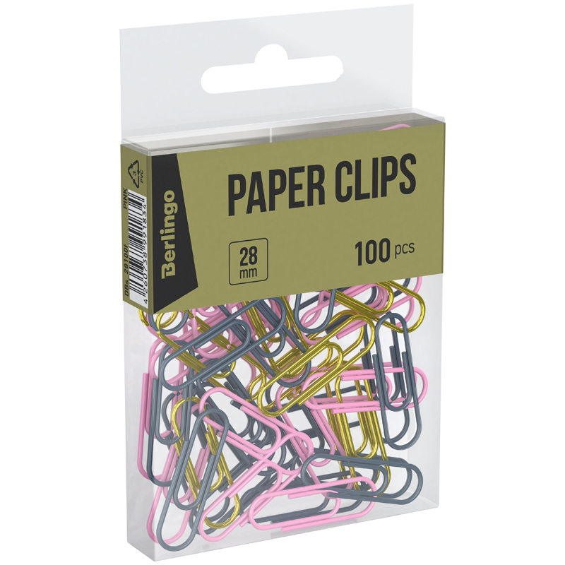 О товаре «Скрепки 28мм, Berlingo, 100шт., цветные, ПВХ упак., европодвес, розовый+золотой»