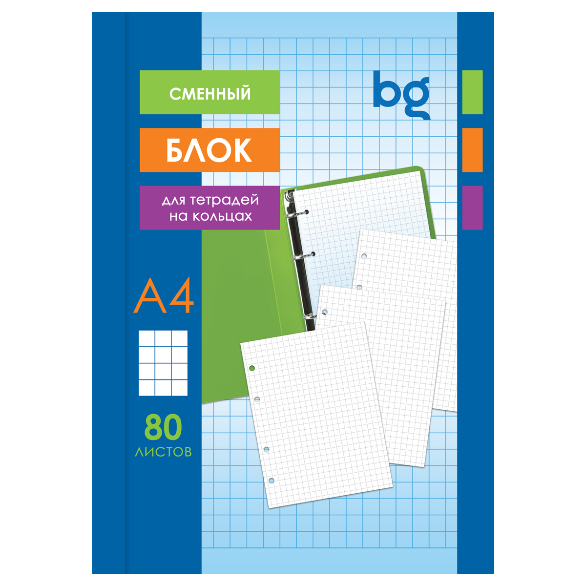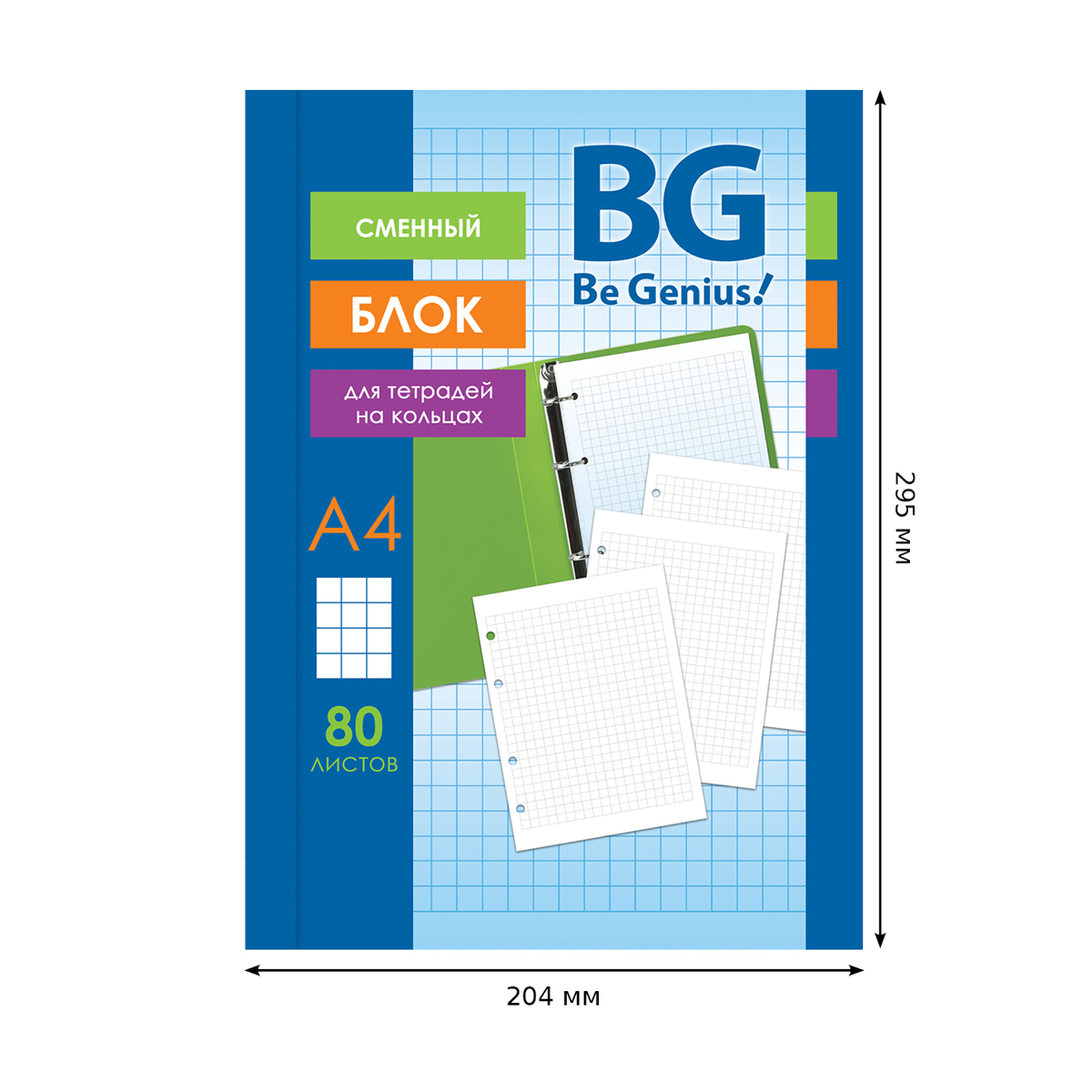 Сменный блок BG формата А4 подойдёт к тетради с кольцевым механизмом. Размер листов – 204*295 мм. Плотность блока, сделанного из белой офсетной бумаги, составляет 60 г/м2. Показатель высокого качества изделия — 100 % белизны.