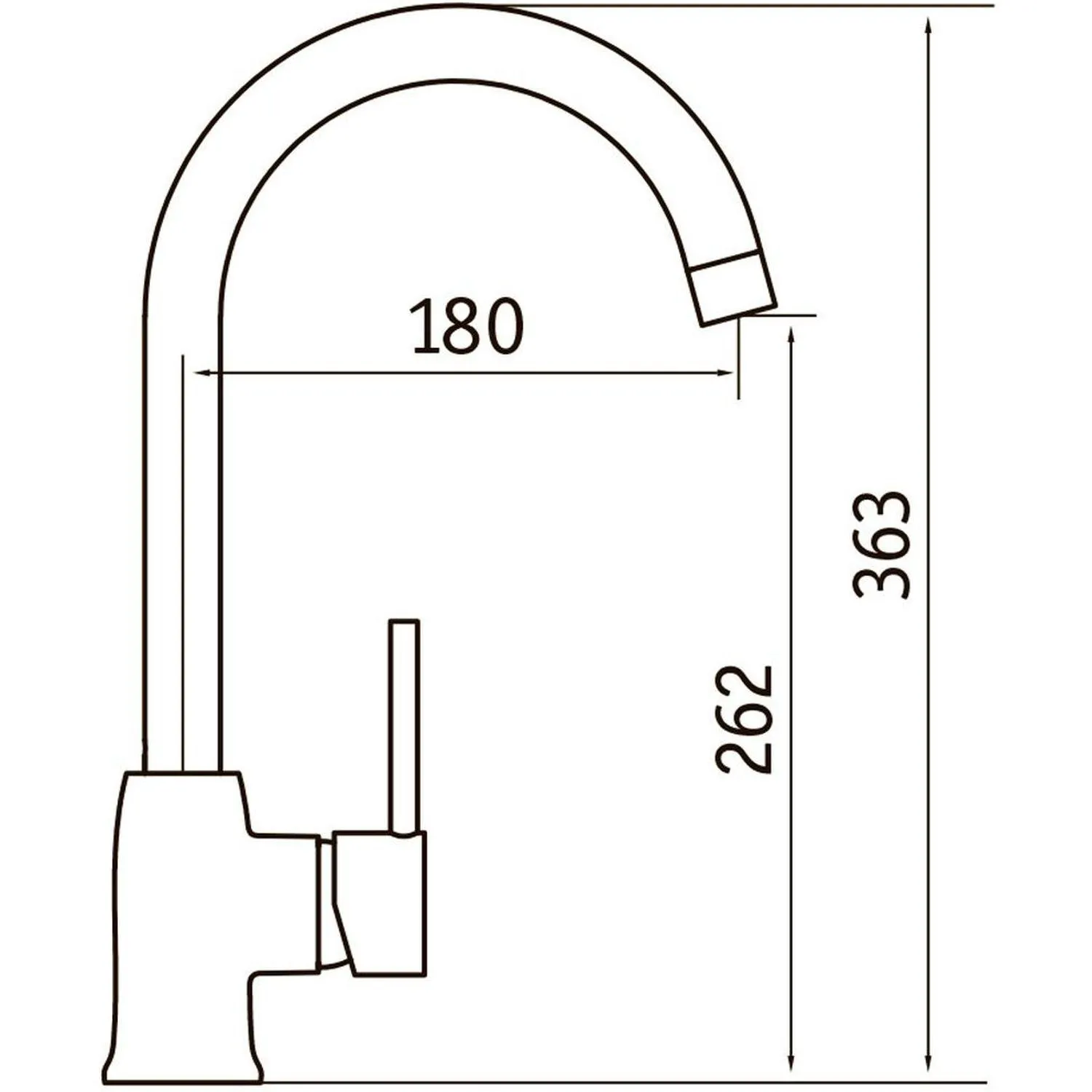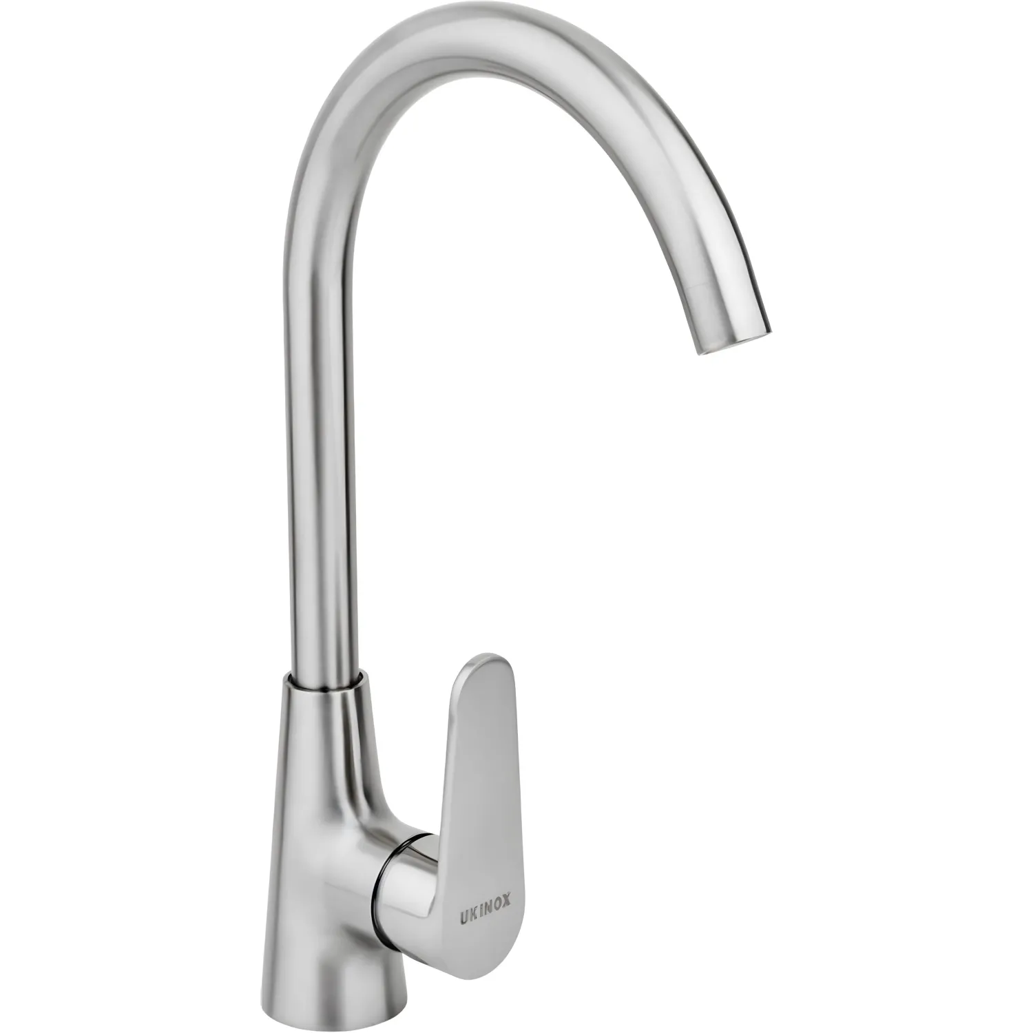 Однорычажный кухонный смеситель из латуни цвета нержавеющая сталь. Снабжён высоким поворотным изливом, удобным для наполнения высокой посуды. Выполнен в современном дизайне, подходящем для любых кухонь.