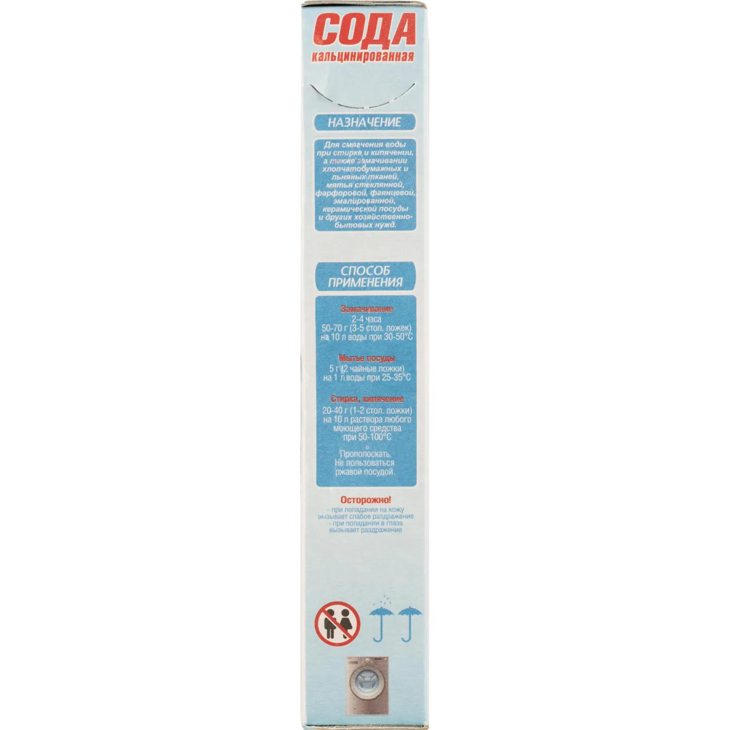 Назначение: предназначена для смягчения воды при стирке и кипячении, замачивания хлопчатобумажных и льняных тканей, а также для мытья стеклянной, фарфоровой, фаянсовой, эмалированной и керамической посуды и других хозяйственно-бытовых нужд.