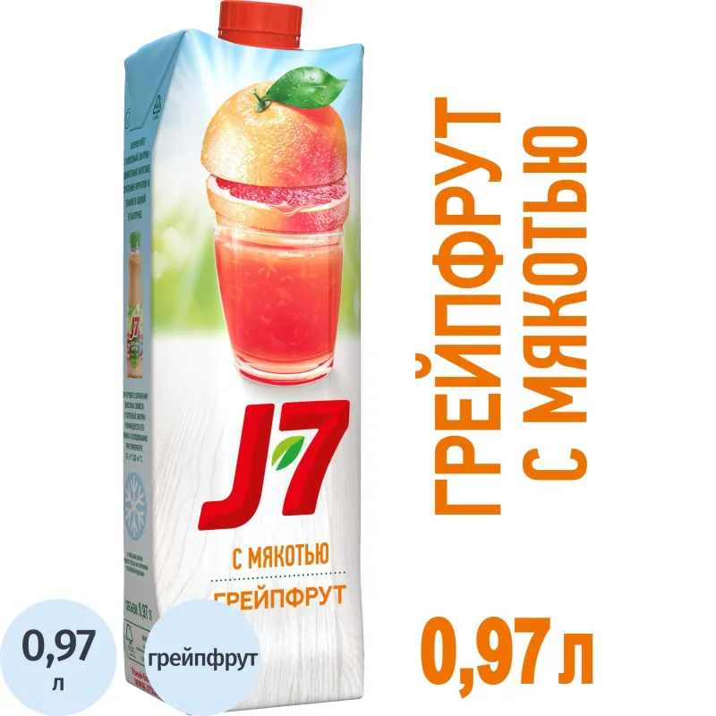 Сок J7 грейпфрут с мякотью 0.97 л. J7 сохраняет энергию солнца, которую впитал в себя красный грейпфрут — ароматный, сладкий и такой манящий. Его яркий вкус подарит вам заряд бодрости и энергию на весь день.