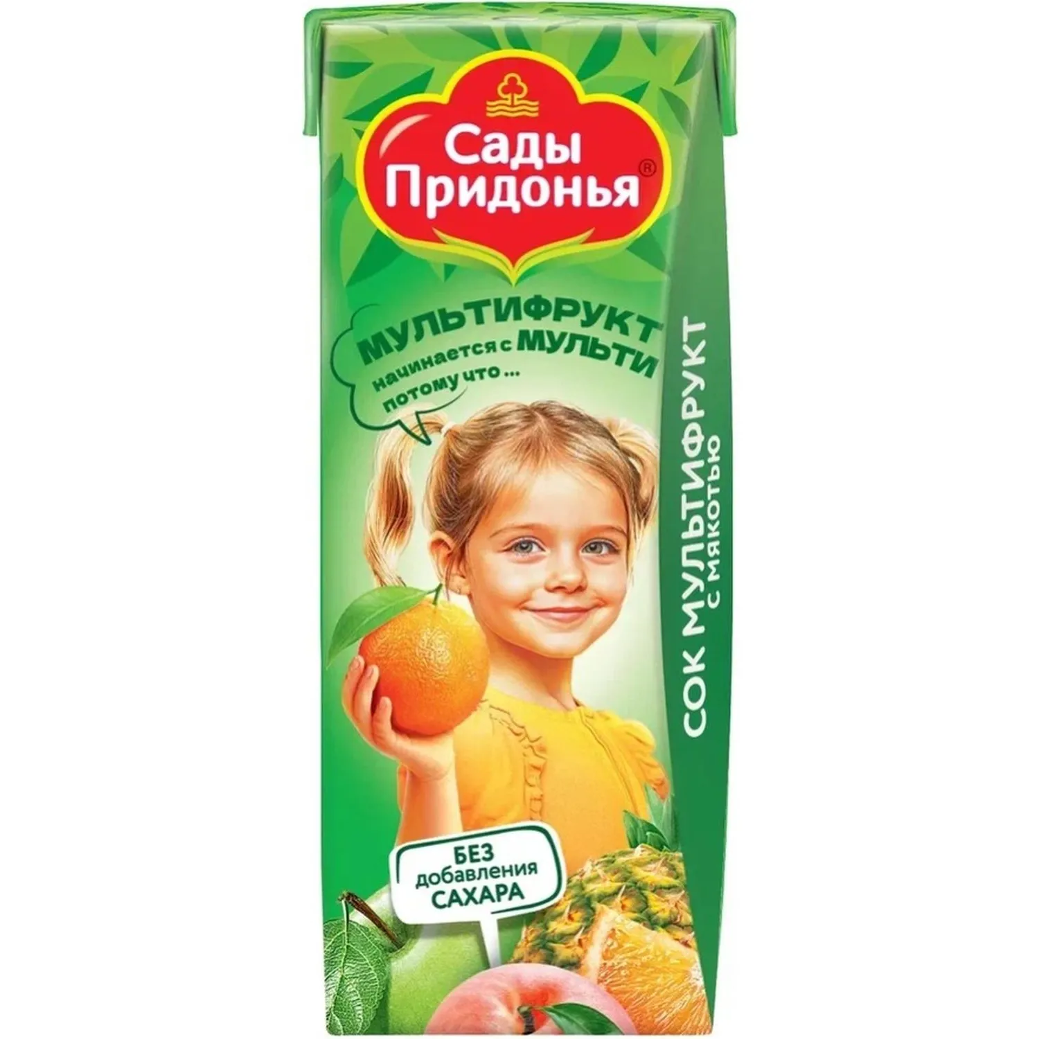 Сок Сады Придонья мультифрукт с мякотью 0.2 л, подходящий для детского питания. Напиток не содержит сахара. Трубочка прилагается.