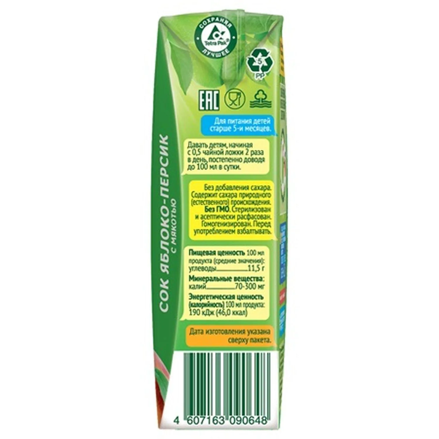 Сок яблоко-персик один из самых популярных вкусов у детей. Мякоть персика не только сочная и вкусная, но и полезная, при этом она легко усваивается детским организмом. Персики богаты фруктовыми углеводами, калием и пищевыми волокнами. Сочетание с соком зелёного яблока придаёт напитку особенно интересное звучание. Содержание пищевых волокон благоприятно влияет на пищеварение. Внешний вид упаковки может различаться.