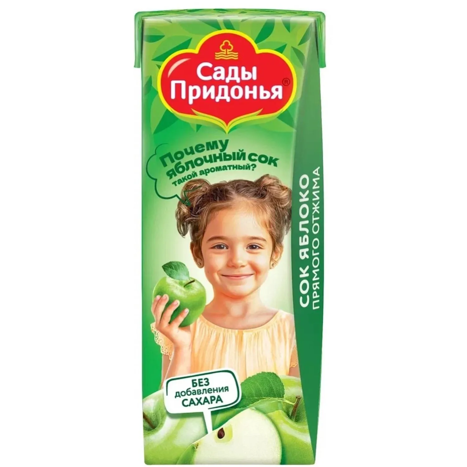 Сок Сады Придонья яблоко 0.2 л. Трубочка прилагается. Сок яблочный из зелёных яблок, восстановленный, остветлённый для детского питания. Без сахара. Содержит сахара естественного происхождения. Пастеризован и асептически расфасован. Без ГМО. произведён из концентрированного яблочного сока из зелёных яблок: «Курский Золотой», «Синап Северный», «Синап Орловский», «Избранница» плодового хозяйства «Сады Придонья». Давать детям, начиная 0,5 чайной ложки 2 раза в день, постепенно доводя до 100 мл в сутки.
