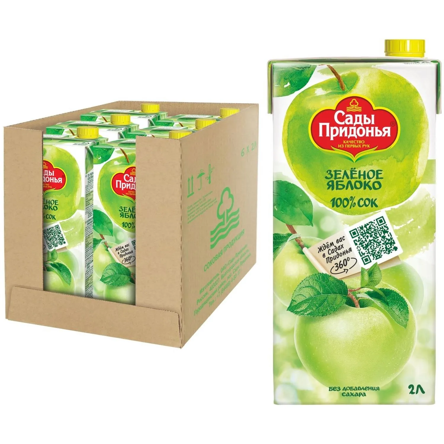 Сок Сады Придонья яблоко 2 литра. Сок Сады Придонья зелёное яблоко производится только из зелёных сортов донских яблок. Северный Синап, Избранница, Курский Золотой — сок из этих яблок обладает самыми низкими аллергенными свойствами, поэтому хорошо переносится, подходит всем без исключения и имеет приятный освежающий кисло-сладкий вкус.