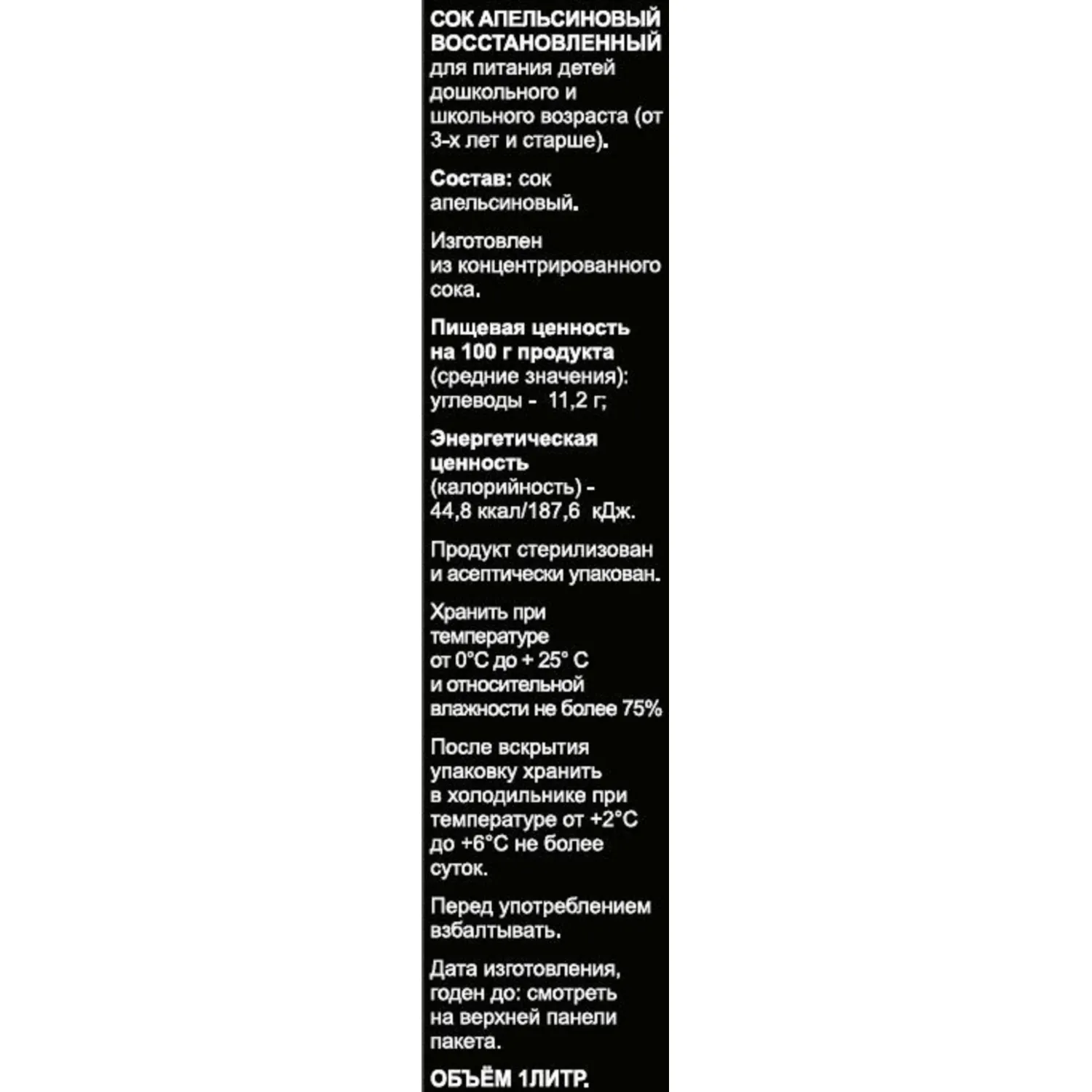 Сок из апельсина 100%, без сахара, консервантов, красителей. Сочетание насыщенного вкуса спелого бодрящего апельсинового сока.