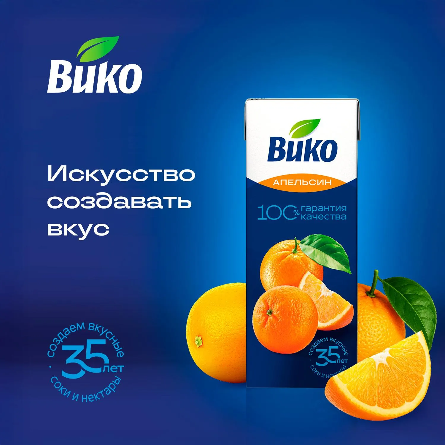 Натуральный апельсиновый сок Вико буквально излучает яркость и энергию отборных апельсинов. Премиальное качество сока подчёркивается его осветлёнными тонами, приятной текстурой и гармоничным вкусом.