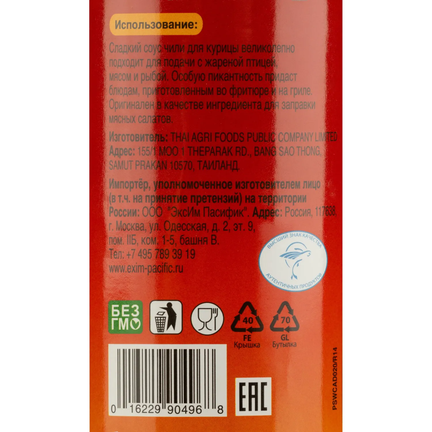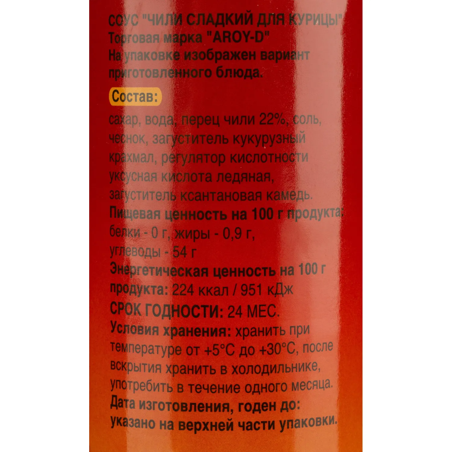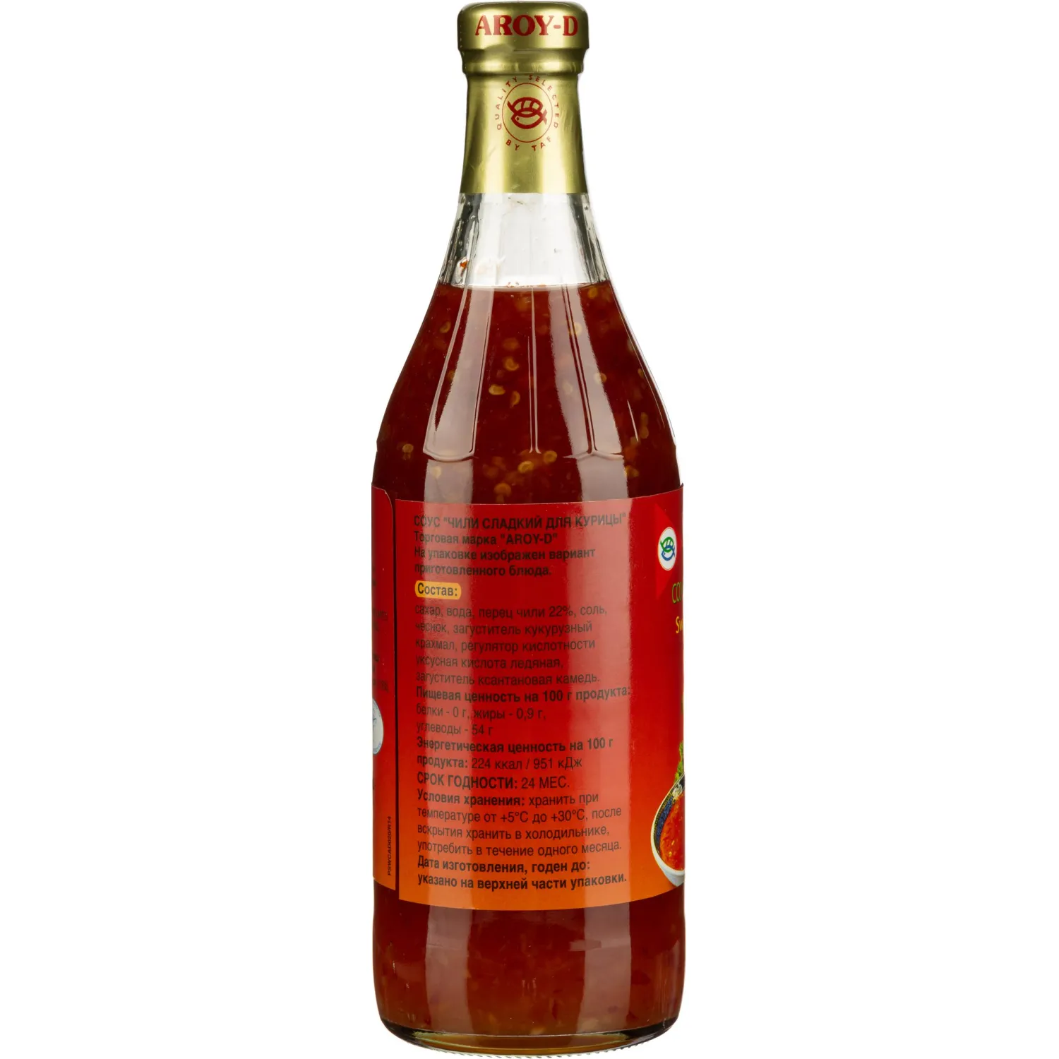 Сладкий соус чили Aroy-D для курицы является незаменимым ингредиентом тайской кухни. Он подаётся к блюдам из птицы, мясу или морепродуктам, а также сочетается со спринг-роллами — рулетиками в рисовой бумаге. Вкус этого овощного соуса приятный и исключительно гармоничный, острый и одновременно сладковатый, великолепно оттеняет блюда, придавая им пикантность.
