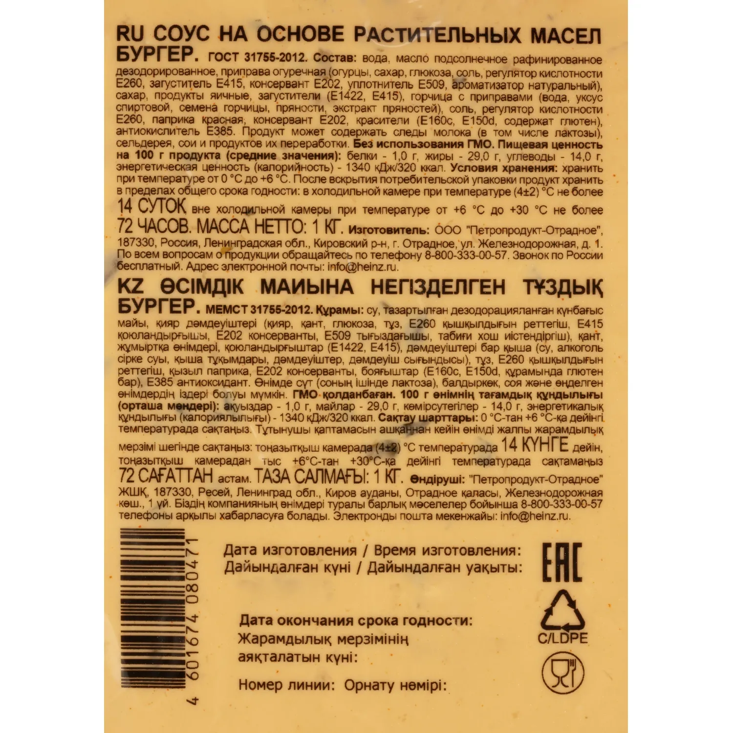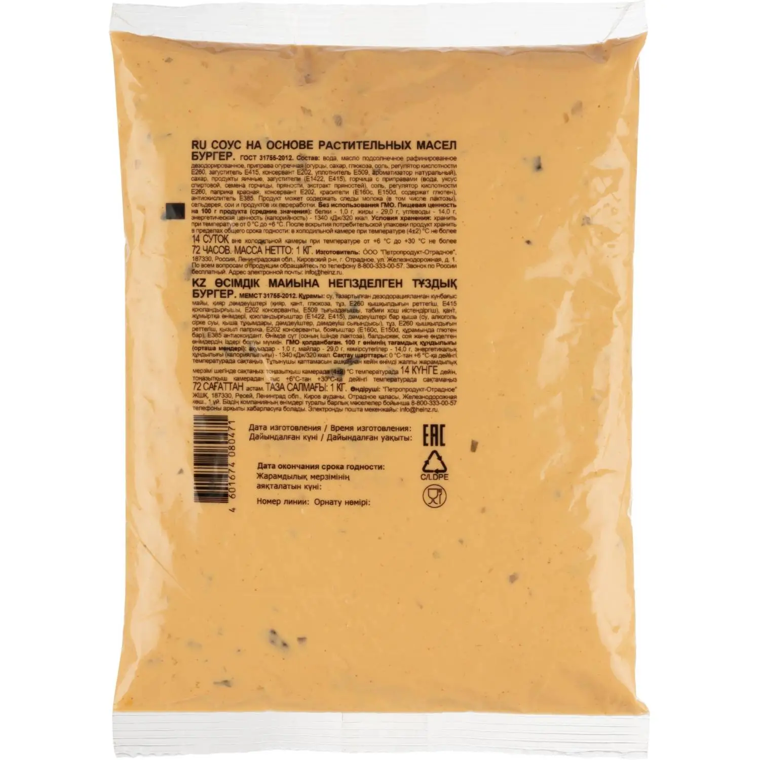 Соус Heinz Бургер — нежный и слегка острый, подходит ко всем блюдам фастфуда: бургерам и хот-догам, пицце и роллам, шаурме и закускам в формате finger food — начос, куриным стрипсам и крылышкам. Его также можно подавать в качестве дипа к картофелю по-деревенски или фри, домашним чипсам или луковым кольцам во фритюре. В меню ресторана соус Бургер Хайнц отлично сочетается с мясом на гриле и сэндвичами с пастрами. Соус Бургер Хайнц идеален для салатов в американском стиле, запекания курицы, индейки, свинины и говядины, приготовления мяса по-французски и ромштекса.
