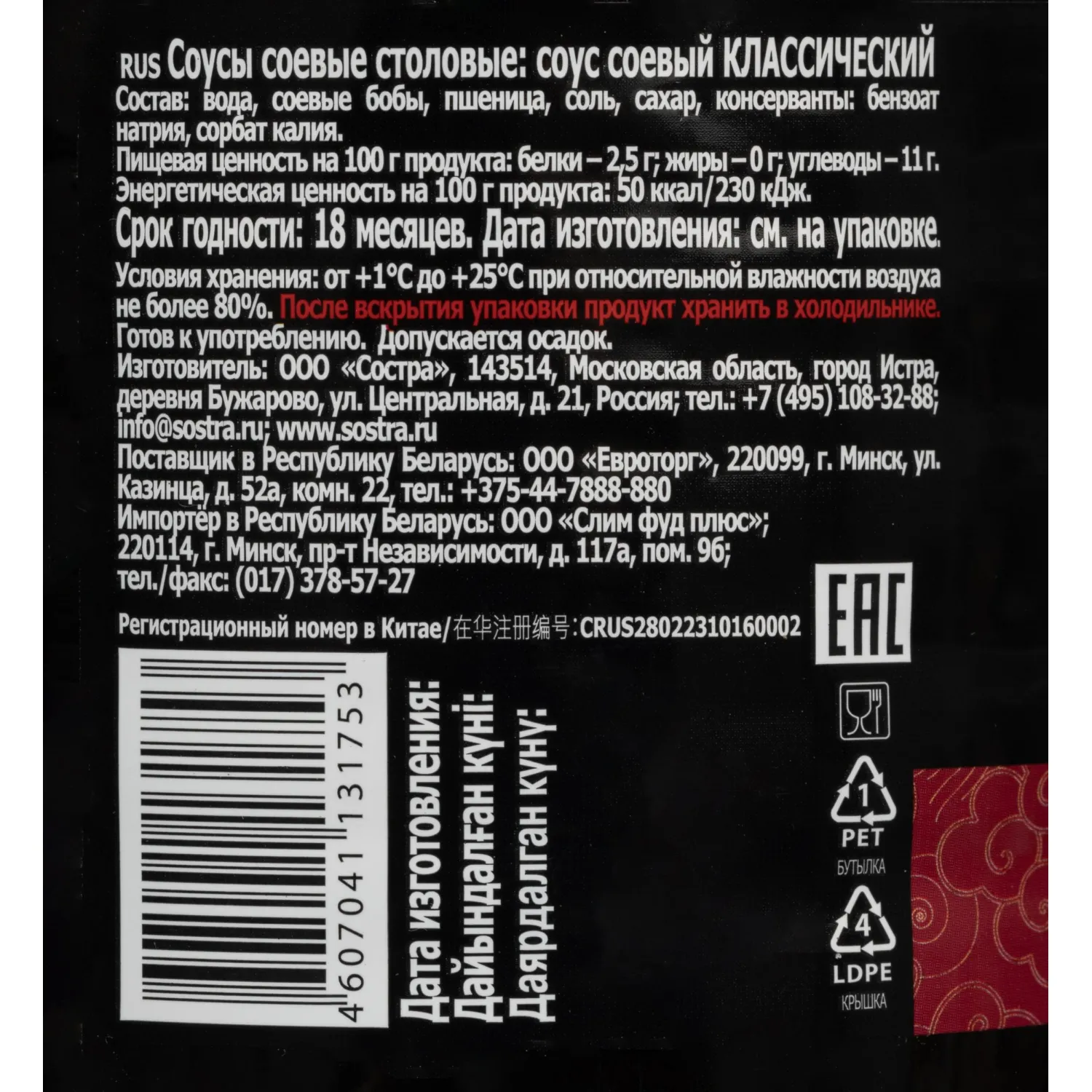 Соус соевый «Сэн Сой классический» 1 л. Эргономичная бутылка и выгодная упаковка. Превосходная приправа к блюдам из овощей, птицы и мяса. Придаст тонкий аромат и изысканный вкус любым гарнирам, пельменям и даже яичнице. Можно как добавлять в уже готовые блюда, так и использовать для их приготовления (жарки, тушения, маринования). Полиэтиленовая бутылка объемом в 1 литр очень удобна в транспортировке, эксплуатации и хранении, а также — это экономически выгодное решение для кафе, ресторанов и точек быстрого питания.