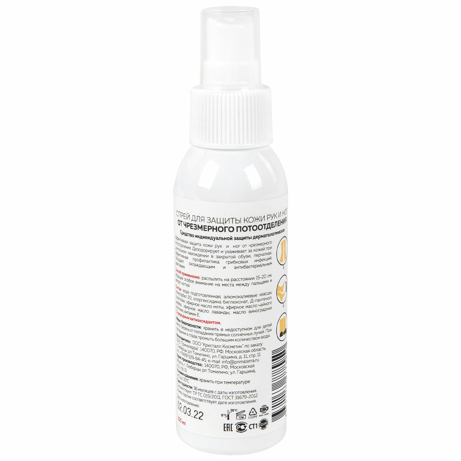 Эффективная защита от потоотделения. Дезодорирует и ухаживает за кожей при длительном нахождении в закрытой обуви, перчатках.