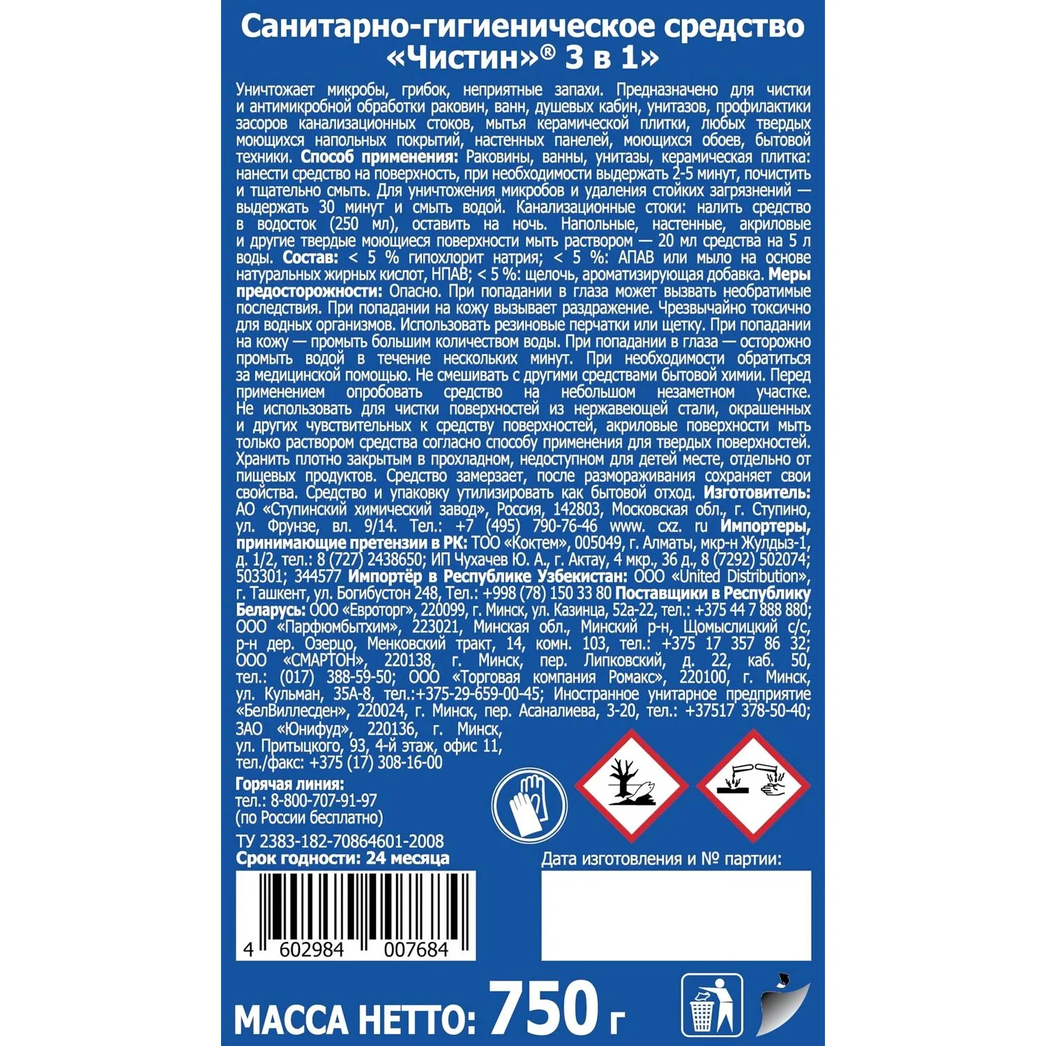 Меры предосторожности: при работе использовать резиновые перчатки. При попадании средства в глаза или на кожу промыть большим количеством воды, при необходимости обратиться к врачу. Хранить в недоступном для детей месте.