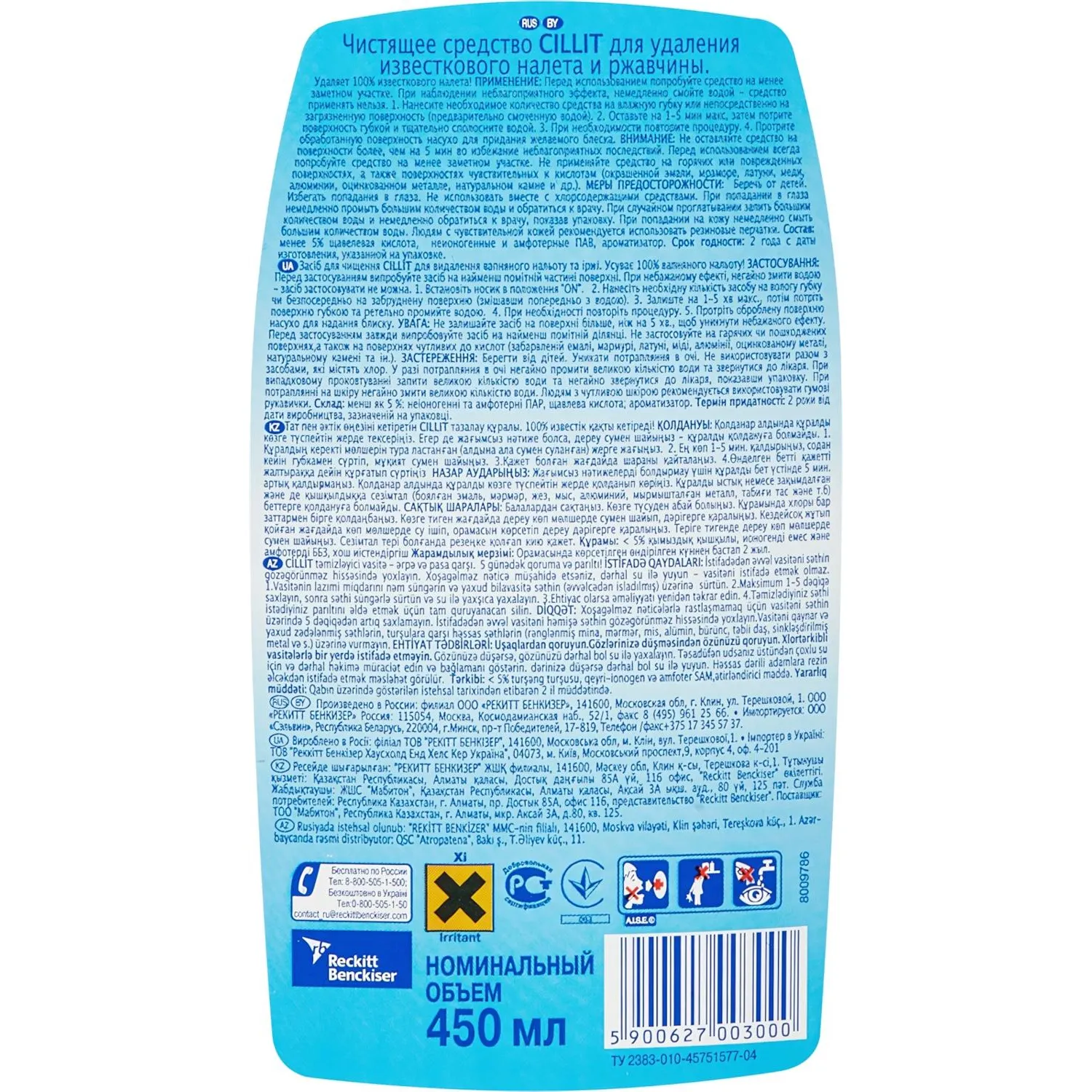 Назначение: средство предназначено для удаления известкового налёта и ржавчины с различных поверхностей в туалетных и ванных комнатах.