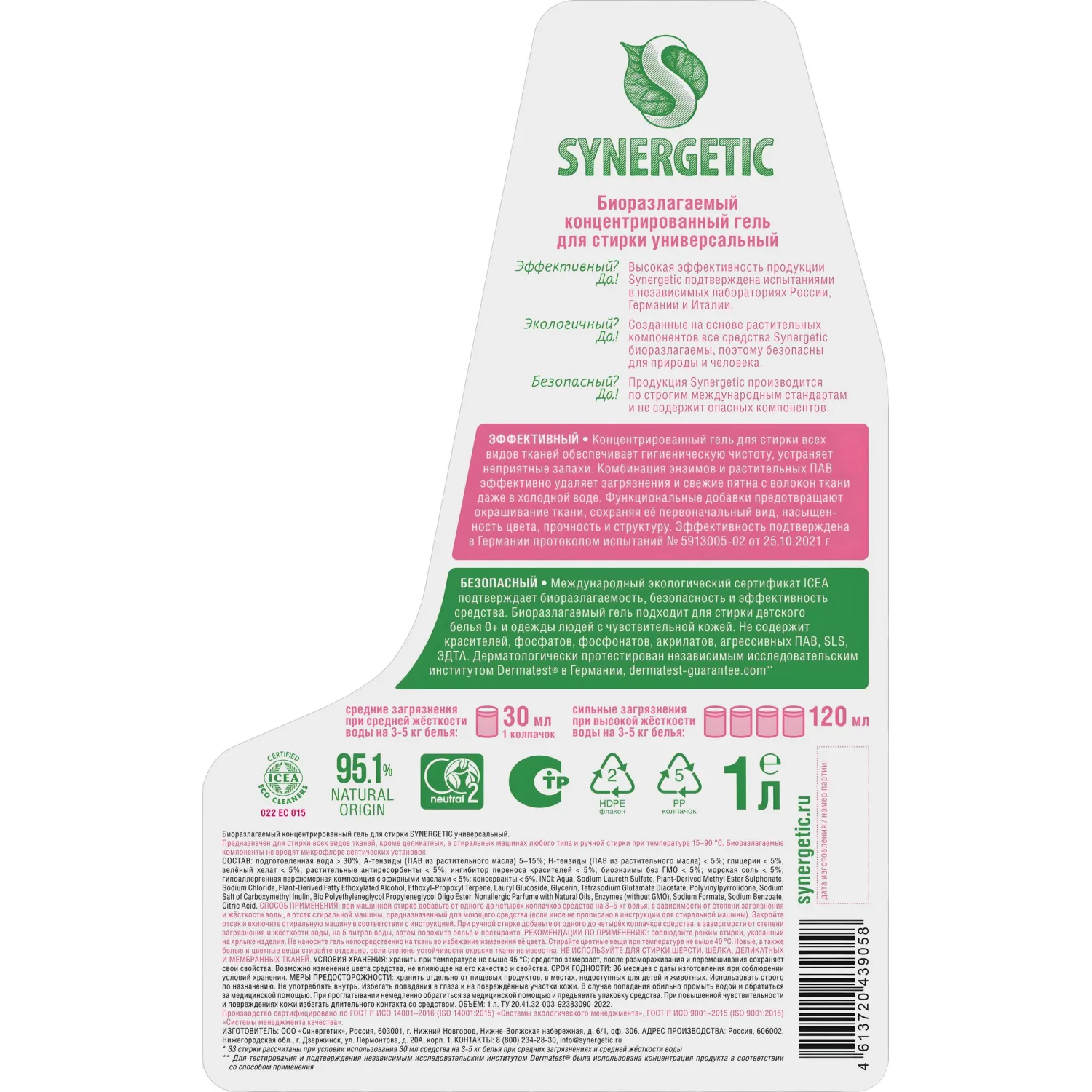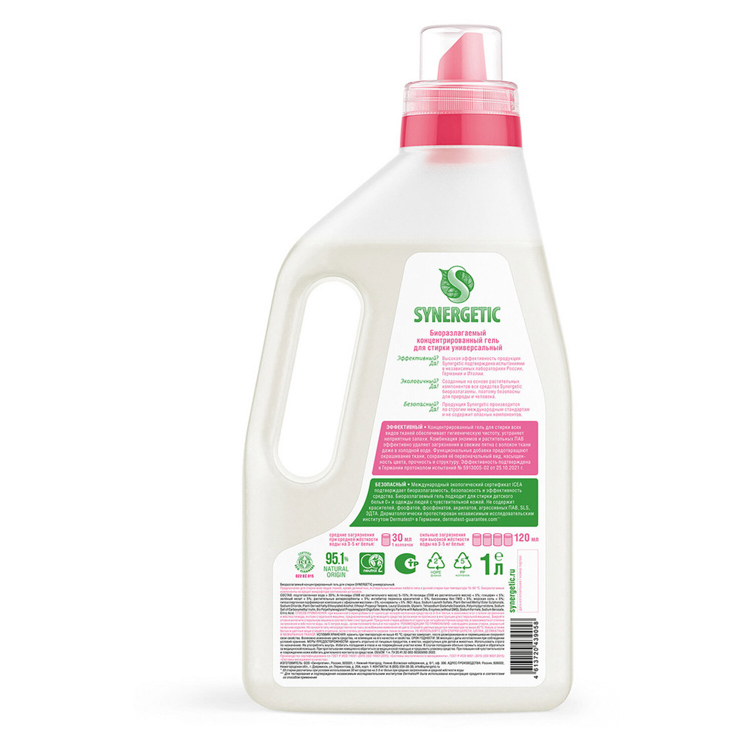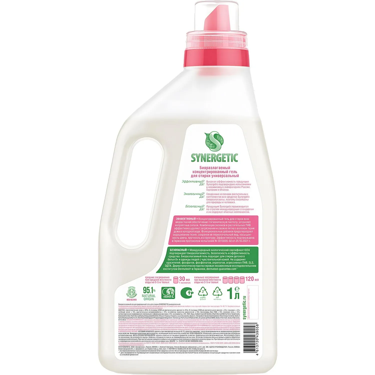 Гель для стирки Synergetic 1 л. Назначение: средство предназначено для стирки любых видов тканей. 100% смываемость, не остается на одежде. 100% биоразлагаемое. Эффективно для всех типов стиральных машин и ручной стирки при температуре от 20°C до 60°C. Способ применения: гель для стирки Synergetic подходит для ручной и машинной стирки. При использовании в стиральной машине заливается в отсек для жидких и сыпучих средств или непосредственно в барабан. Дозировка в зависимости от степени загрязнений: на 5 кг белья достаточно 1 колпачка средства (30 мл) при обычных загрязнениях и 4 колпачка (120 мл) при сильных загрязнениях. Меры предосторожности: хранить в местах недоступных для детей. Не смешивать с другими средствами бытовой химии. При попадании средства в глаза промыть водой. Использовать строго по назначению. Состав: подготовленная вода >30%, комплекс растительных А-тензидов 5–15%, комплекс растительных Н-тензидов <5%, зеленый хелат <5%. Условия хранения: под воздействием прямых солнечных лучей возможно изменение цвета. Средство замерзает, после размораживания и перемешивания сохраняет свои свойства. Срок годности: 24 месяца с даты производства. В основе продукта растительные компоненты. Биоразлагаемый в воде. Не вредит микрофлоре септических установок для очистки сточных вод.