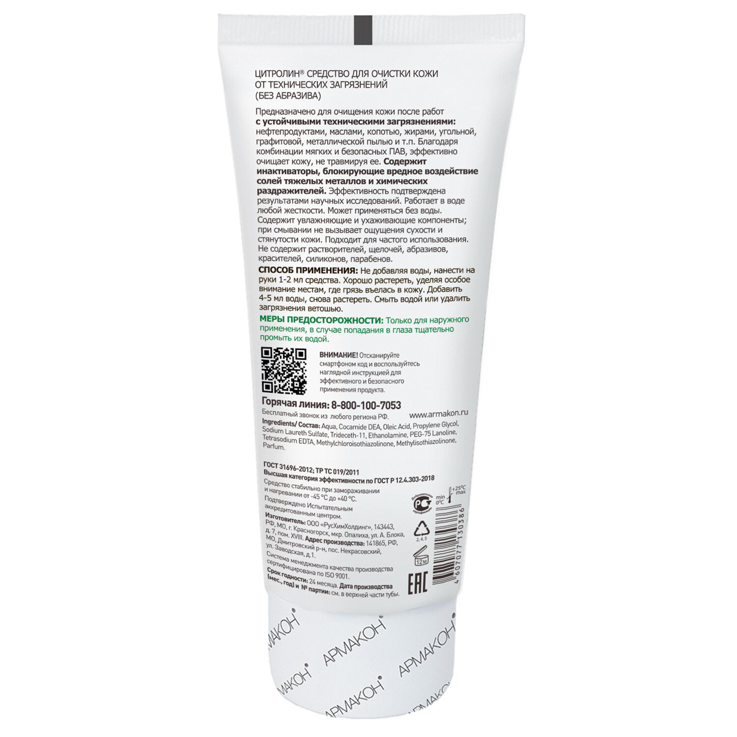 Очищающий гель Армакон Цитролин представляет собой средство для очистки кожи от технических загрязнений, не содержит абразива и позволяет легко удалить загрязнения технического характера (нефтепродуктов, масел, копоти, жира, угольной, графитовой, металлической пыли) с кожи рук. Благодаря комбинации мягких и безопасных ПАВ, средство наносится эффективно очищает кожу, не травмируя ее. Содержит инактиваторы, нейтрализующие вредное воздействие солей тяжелых металлов и химических раздражителей. Эффективность подтверждена научными исследованиями. Эффективно в воде любой жесткости; возможно применение без воды. Применим повсеместно при работах в условиях сильного загрязнения трудноудаляемыми материалами для обеспечения эффективной, бережной очистки кожи. Широко используется в машиностроении, железнодорожном транспорте, добыче полезных ископаемых (угля, нефти, газа, руды и т.д.), автотранспортных предприятиях, химическом производстве и так далее. С помощью средства Цитролин возможна эффективная очистка кожи без использования воды, достаточно удалить грязь салфеткой или ветошью. Средство подходит для частого использования. Обладает приятным ароматом. В состав включены увлажняющие и ухаживающие компоненты (олеиновая кислота, пропилен гликоль, ланолин). Не содержит растворителей, щелочей, абразивов, красителей, парабенов. Не добавляя воды нанести на руки небольшое количество (1-2 мл.) средства Цитролин. Хорошо втереть в течение 20 секунд, уделяя Особое внимание местам, где грязь въелась в кожу. Добавить небольшое количество воды (4-5 мл) и снова растереть в течение 20 секунд. Смыть водой или удалить загрязнения ветошью. Соответствует стандартам ТР ТС 019/2011, ГОСТ 31696-2012. Упаковка: туба 200 мл. Условия хранения: избегать попадания прямых солнечных лучей. Срок годности от даты изготовления 24 месяца.
