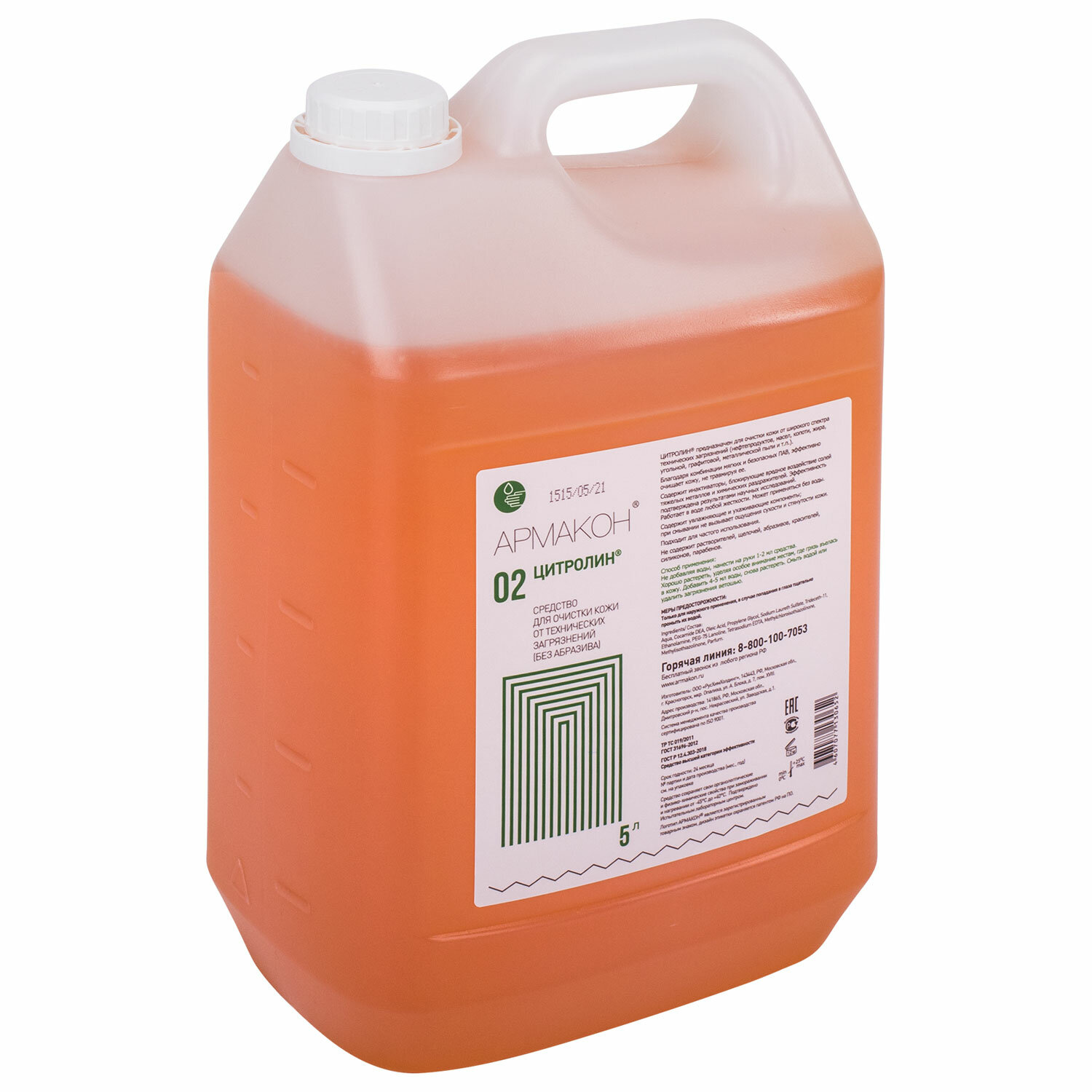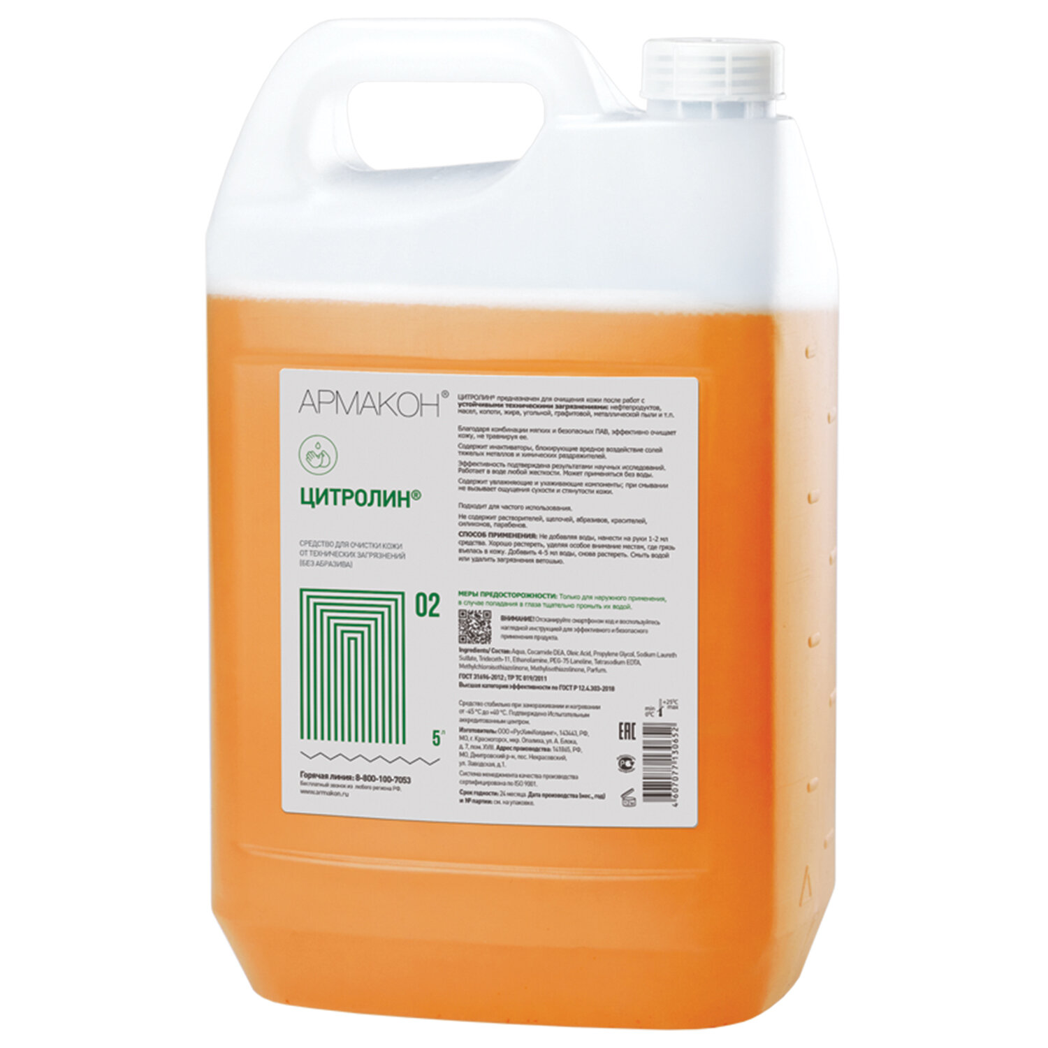 Очищающий гель Армакон Цитролин представляет собой средство для очистки кожи от технических загрязнений, не содержит абразива и позволяет легко удалить загрязнения технического характера (нефтепродуктов, масел, копоти, жира, угольной, графитовой, металлической пыли) с кожи. Благодаря комбинации мягких и безопасных ПАВ, средство наносится эффективно очищает кожу, не травмируя ее. Содержит инактиваторы, нейтрализующие вредное воздействие солей тяжелых металлов и химических раздражителей. Эффективность подтверждена научными исследованиями. Эффективно в воде любой жесткости; возможно применение без воды. В состав включены увлажняющие и ухаживающие компоненты (олеиновая кислота, пропилен гликоль, ланолин). Средство подходит для частого использования. Обладает приятным ароматом. Не содержит растворителей, щелочей, абразивов, красителей, парабенов. Применение: нанести на сухую кожу, хорошо втереть, затем смыть большим количеством воды. Поставляется в пластиковой канистре объемом 5000 мл. Соответствует стандартам ТР ТС 019.2011, ГОСТ 31460-2012, ГОСТ 31696-2012. Условия хранения: избегать попадания прямых солнечных лучей. Срок годности от даты изготовления 24 месяца.