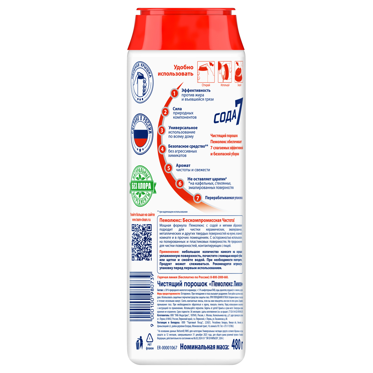 Мощная формула ПЕМОЛЮКС с содой и мягким абразивом подходит для чистки керамических, эмалированных, металлических и других твердых поверхностей на кухне, в ванной комнате и прочих помещениях. С осторожностью использовать на полированных и пластиковых поверхностях. Не предназначен для чистки поверхностей, контактирующих с пищей.
