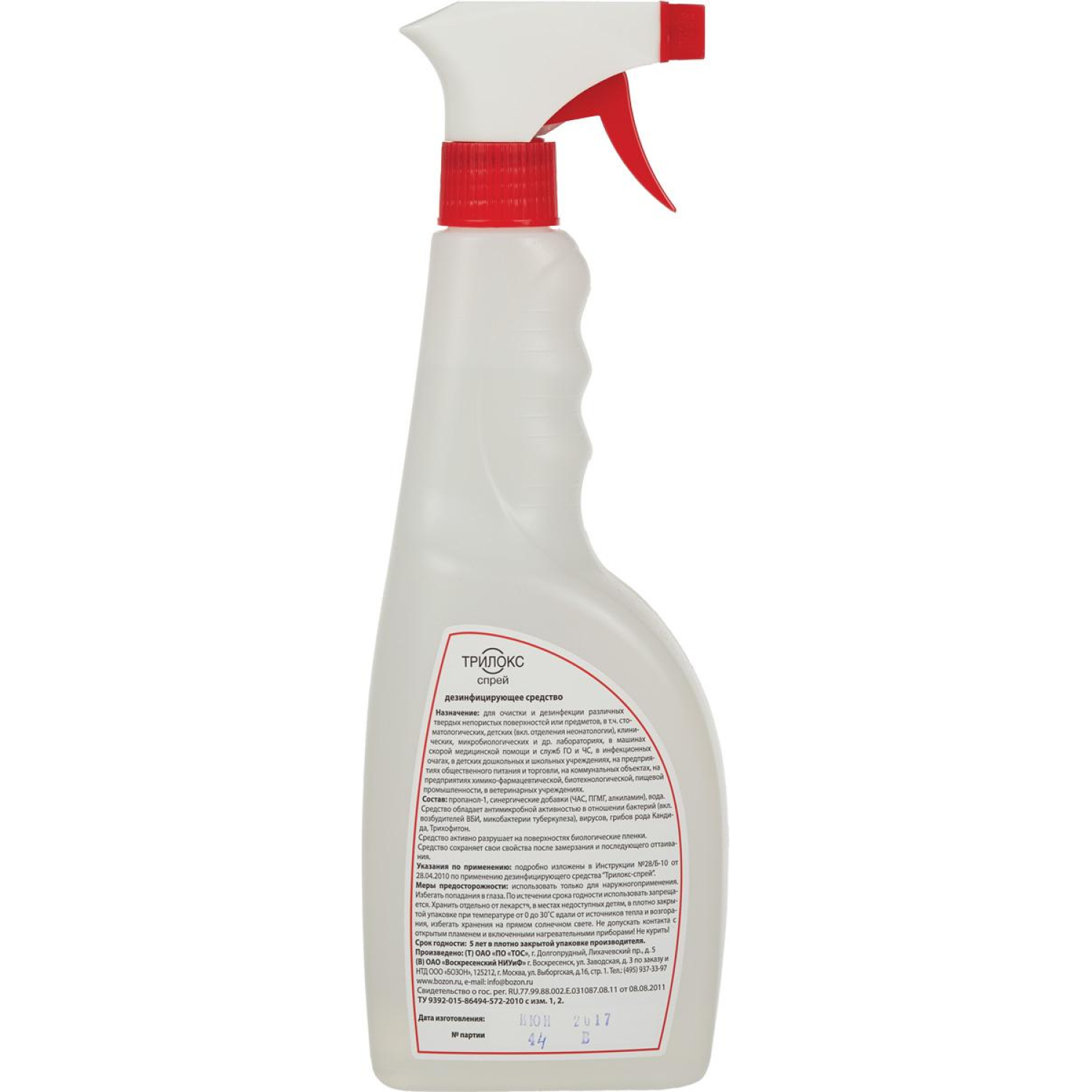 Состав: в качестве действующих веществ содержит 1-пропанол — (26,0 + 2,0)% и синергетические функциональные добавки: алкилдиметилбензиламмоний хлорид (0,02 + 0,002)%, полигексаметиленгуанидин гидрохлорид — 0,04%, N, N-бис (3-аминопропил) додециламин — 0,02%. Консистенция, свойства дезинфицирующего средства Трилокс спрей: средство представляет собой готовую к применению прозрачную жидкость со слабым характерным запахом спирта и применяемой отдушки.