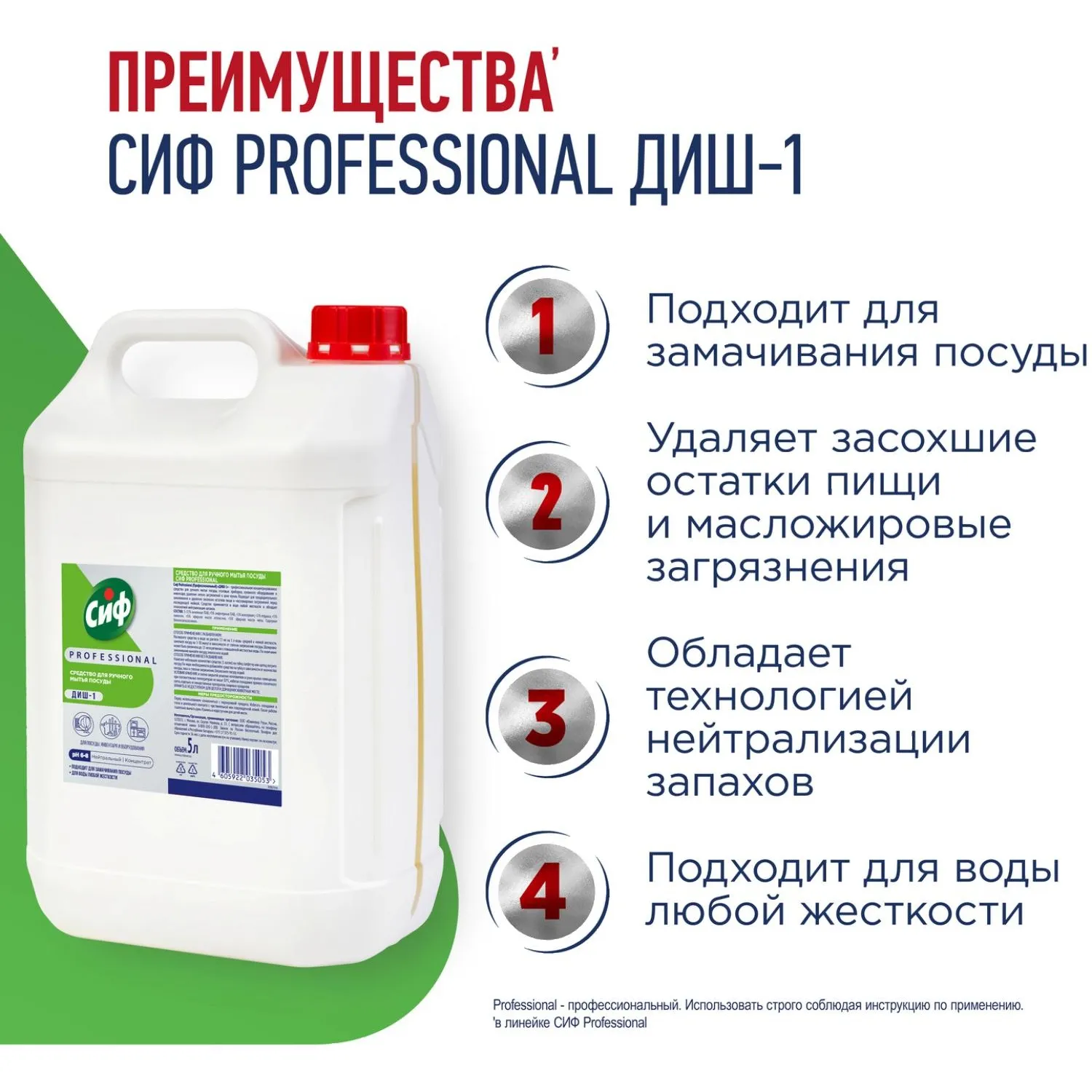 Назначение: средство для мытья посуды Сиф Professional ДИШ-1 предназначено для ручного мытья посуды, столовых приборов, кухонного оборудования и инвентаря, удаления лёгких загрязнений в зоне кухни, подходит для предварительного замачивания и удаления засохших остатков пищи и масложировых загрязнений перед последующей мойкой.