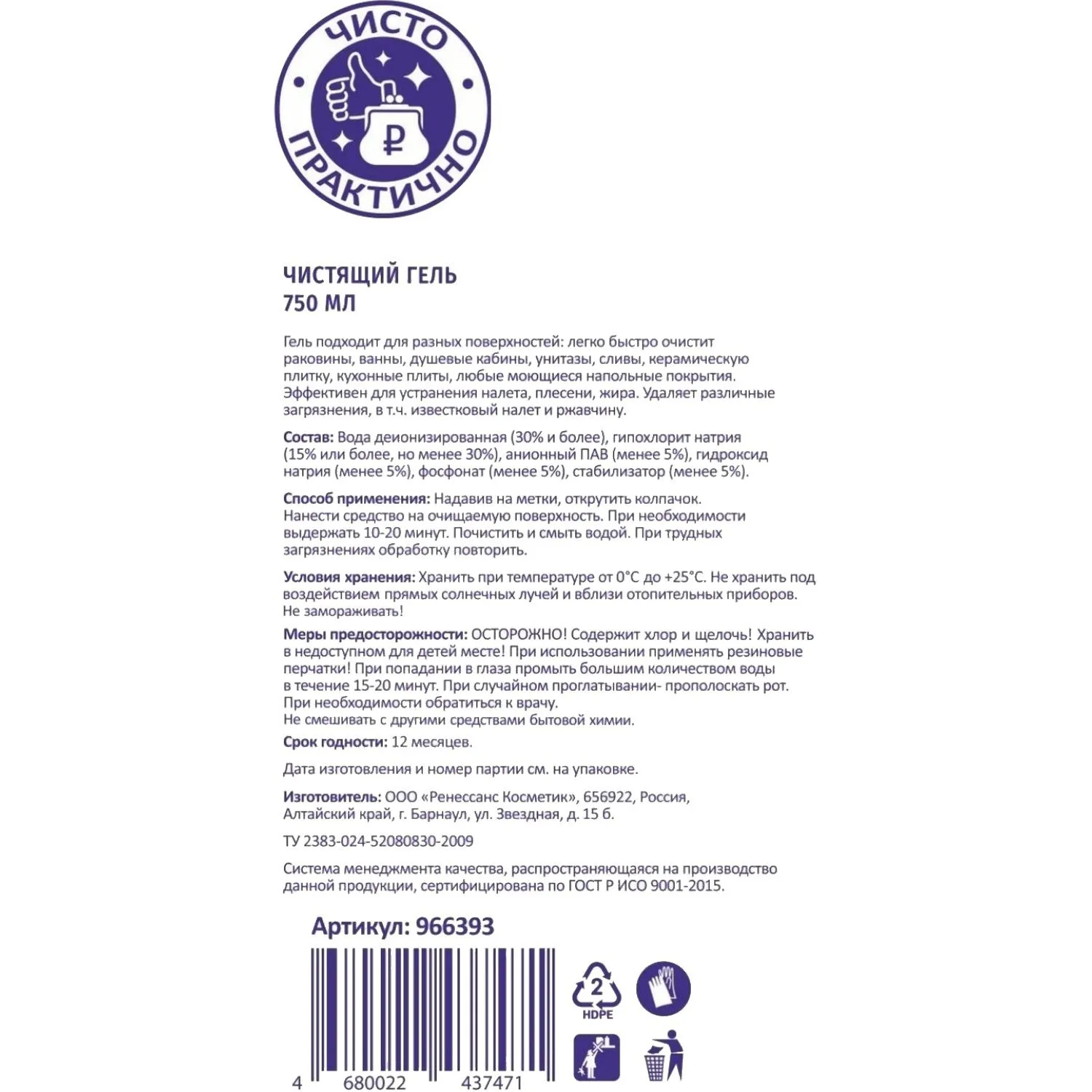Состав: вода деионизированная (≥30%), гипохлорит натрия (≥15%, но <30%), анионный ПАВ (<5%), гидроксид натрия (<5%), фосфонат (<5%), стабилизатор (<5%).