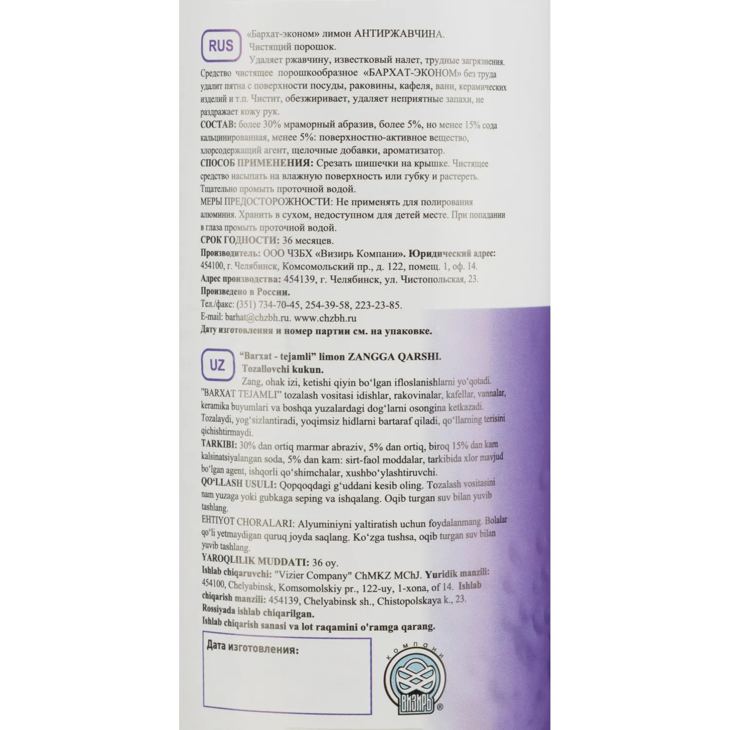 О товаре «Универсальное чистящее средство Бархат Лимон порошок 400 г»