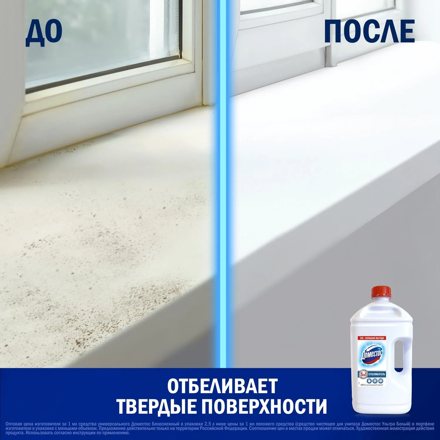 - Пластиковые подоконники: 180 мл Доместос на 5 л воды. Смочите губку в растворе и обработайте подоконник. Для застарелых загрязнений можно нанести Доместос без разбавления на губку и обработать поверхность, оставить на 15-30 минут, далее смыть влажной губкой. Избегать попадания неразбавленного геля на стекло.