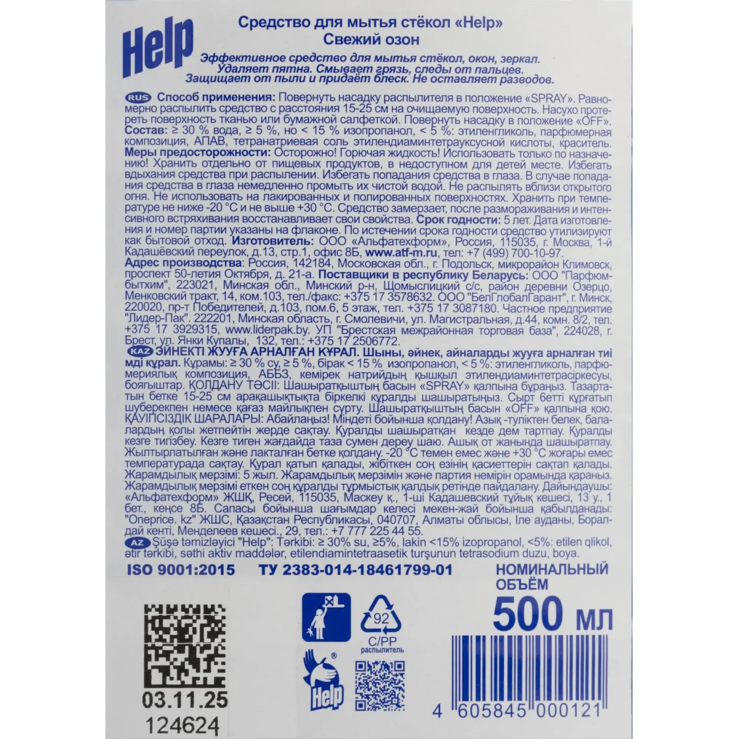 О товаре «Средство для мытья стёкол и зеркал Help Свежий озон 0.5 л»