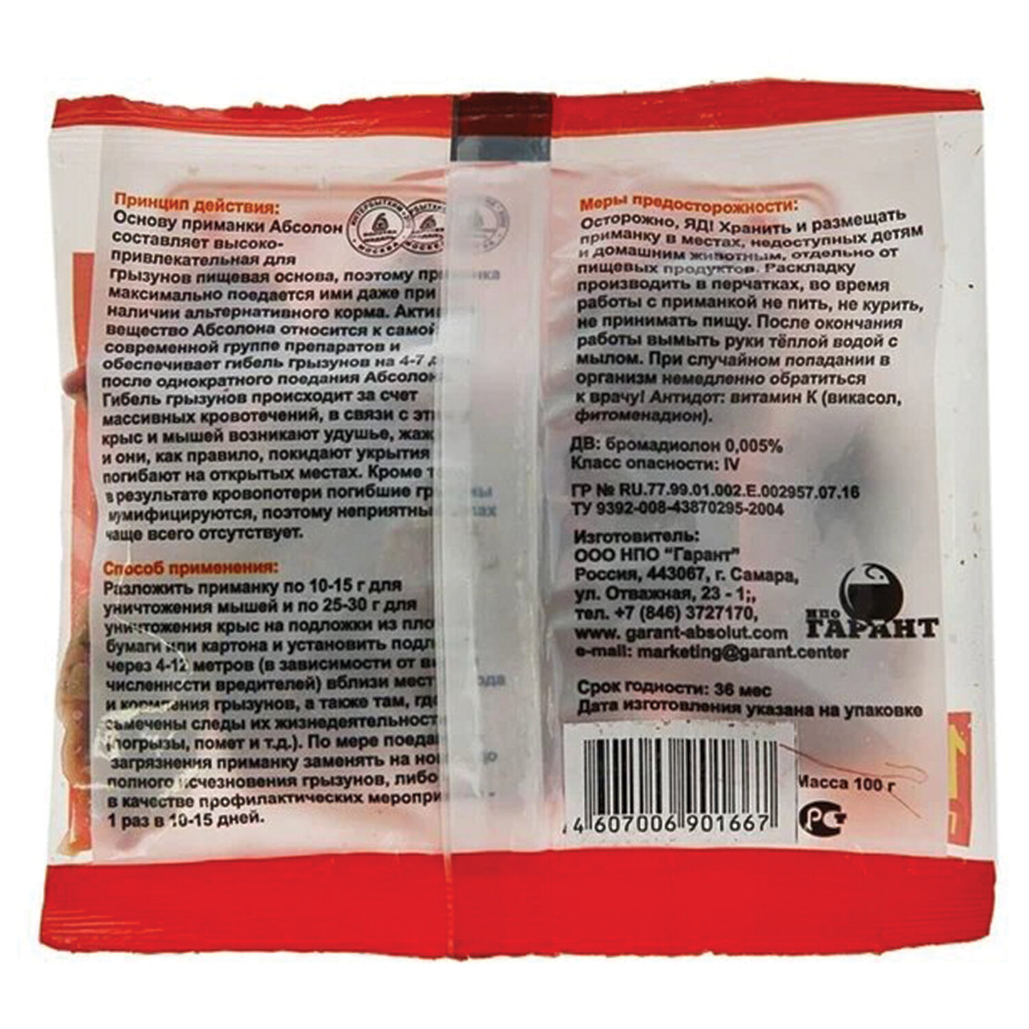 Действующее вещество бромадиолон 0,005%, краситель красный, пищевая основа, битрекс (горький компонент).