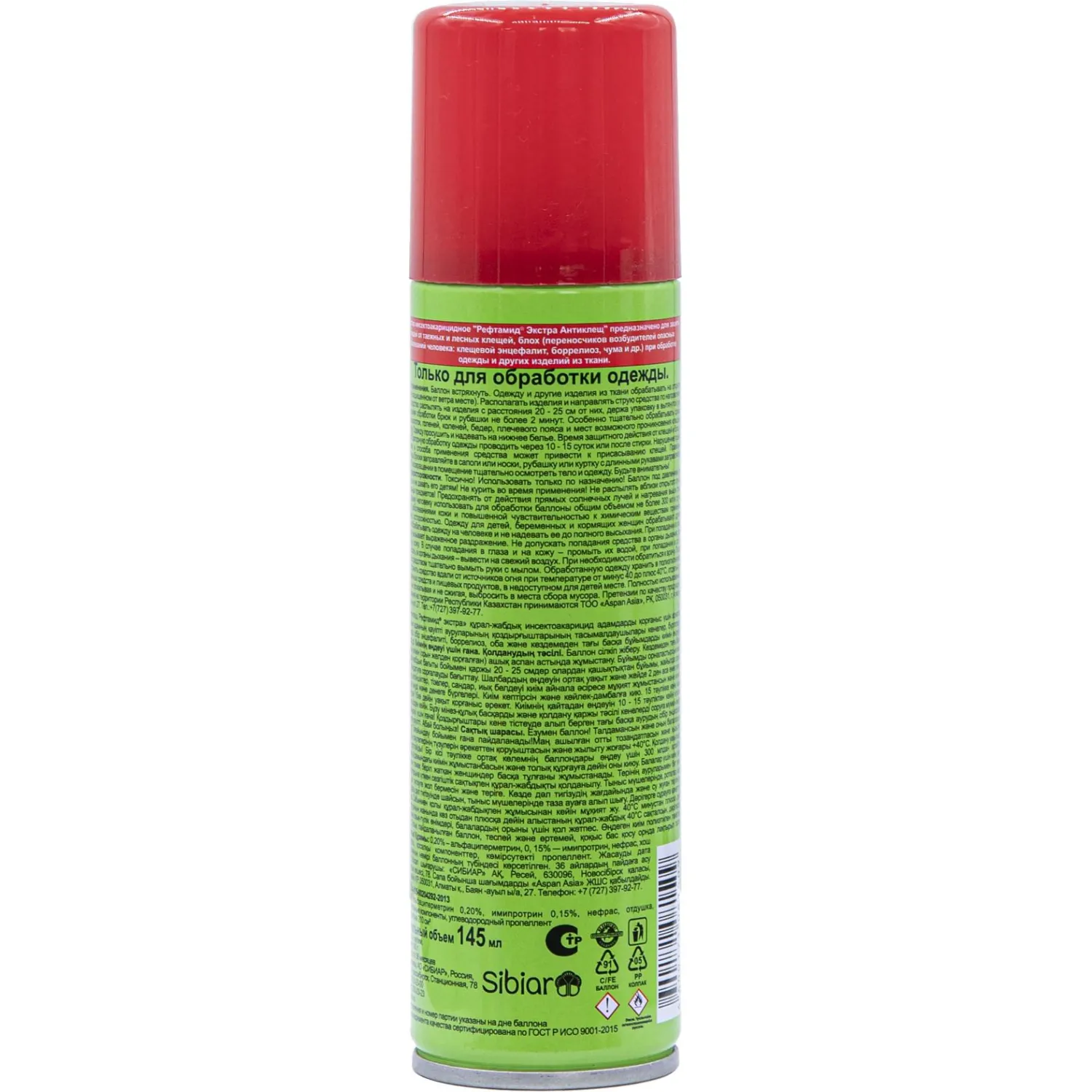 Способ применения: Используйте средство при температуре не ниже +10°С. Перед применением встряхните баллон. Обрабатывайте одежду и другие текстильные изделия на открытом воздухе, в защищённом от ветра месте. Направляйте струю средства по направлению ветра, держа упаковку на вытянутой руке. Расстояние от поверхности до баллона должно составлять 20–25 см. Общее время обработки брюк и рубашек не должно превышать 2 минут. Особое внимание уделяйте обработке одежды в области щиколоток, голеней, коленей, бёдер, плечевого пояса и других мест, где возможен контакт с клещами и блохами. После обработки одежду просушите и наденьте на нижнее бельё. Время защитного действия от клещей и блох составляет до 15 суток. Повторную обработку проводите через 10–15 суток или после стирки.