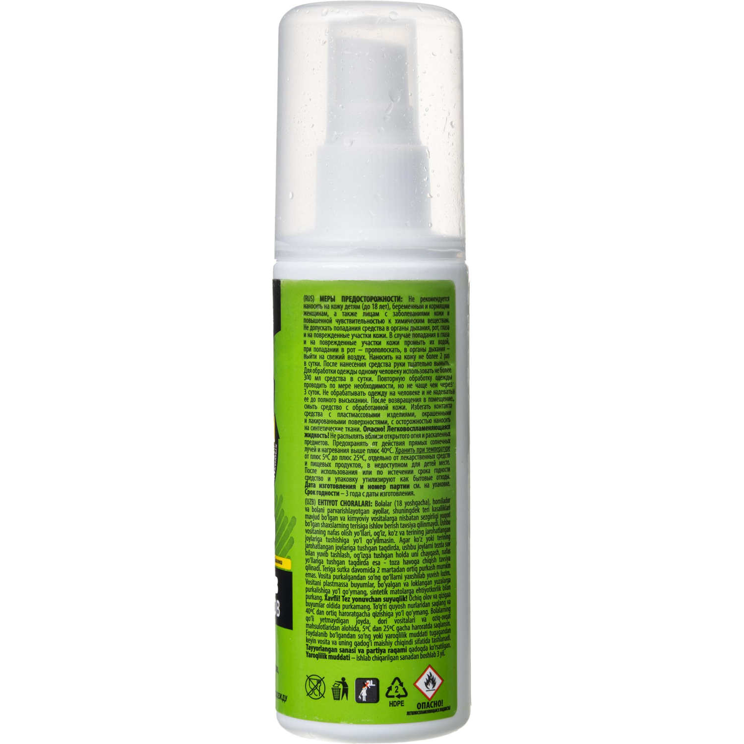 Меры предосторожности: противопоказано для детей до 18 лет, беременных и кормящих женщин, лиц с кожными заболеваниями. Избегать контакта со слизистыми оболочками и повреждённой кожей. Максимальная частота нанесения на кожу — 2 раза в сутки. После обработки обязательно мыть руки. Не носить влажную после обработки одежду. Ограничить контакт с пластиковыми, лакированными и синтетическими поверхностями.